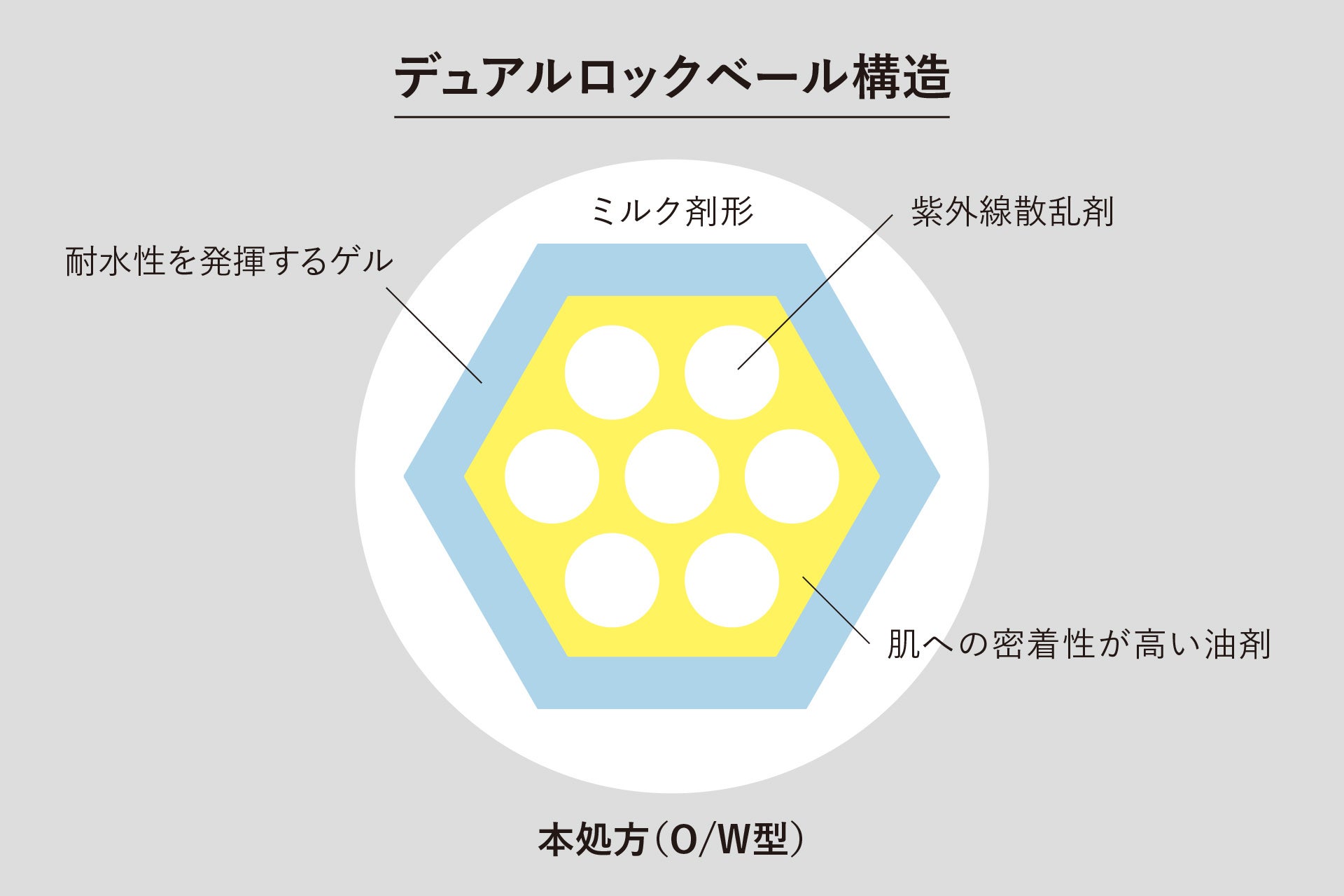①ベタつきやテカリを抑える。特殊処方「デュアルロックベール構造」