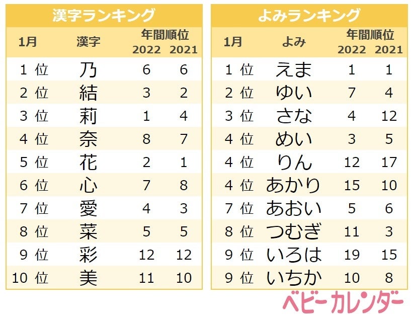 専門家から直接アドバイスを受けられる日本最大※の育児支援サイトを運営する株式会社ベビーカレンダー(旧社名:株式会社クックパッドベビー、本社:東京都渋谷区、代表取締役:安田啓司、以下「ベビーカレンダー」)は、赤ちゃんの名前ランキングを毎月調査・発表しています。11 月 1 日には、2022 年に生まれたお子さん107,289 名を対象に調査した『2022 年赤ちゃんの名前ランキング』を発表しました。