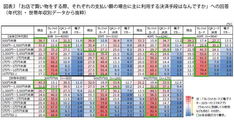 店舗での買い物時に、支払い金額ごとで主にどの決済手段を使うか、図表2で利用率が高かった4種類(カードとスマホ決済の合計)についてまとめたのが図表3です。全体では、“500円未満”の少額だと38.7%が「現金」を使いますが、“500円~1,000円未満” では「QRコード決済」が僅差で首位になり、“1,000円以上” では「クレジットカード」がトップに入れ替わりました。「クレジットカード」の使用率は金額が上がるにつれて上昇し、“5万円以上” では7割超に。一方で「QRコード決済」は “3,000円未満” で3割前後なのが、支払額が増えるほどに比率が低下し、“3万円以上” では1ケタ台に。「電子マネー」も同様の傾向がみられ、チャージが必要なこれらの決済手段は比較的低額な支払いの際に使われていることがわかりました。その点「現金」は、“5万円~10万円未満” で16.7%まで下がりながら “10万円以上” では17.2%に再浮上しており、高額の支払いでも安定的に使われるのは安心感からでしょうか。