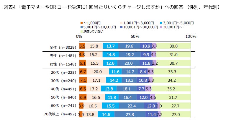 QRコード決済や電子マネーでは、クレジットカードや銀行口座との紐づけやコンビニなどでの店頭入金によりチャージする必要がありますが、1回当たりいくらチャージしているのでしょうか(図表4)。30.8%と最多は「決まっていない」に。残高を一定額にキープするため、使った分をチャージする、という使い方をしているのでしょうか。具体的な金額では「5,001円~1万円」19.6%に続き、「1,001円~3,000円」15.8%、「3,001円~5,000円」13.7%となりました。「1万円超」が計14.6%にとどまるのは、“使い過ぎ” を警戒して、ということもありそうです。年代が上がるほど1回当たりのチャージ額が増える傾向もみられました。