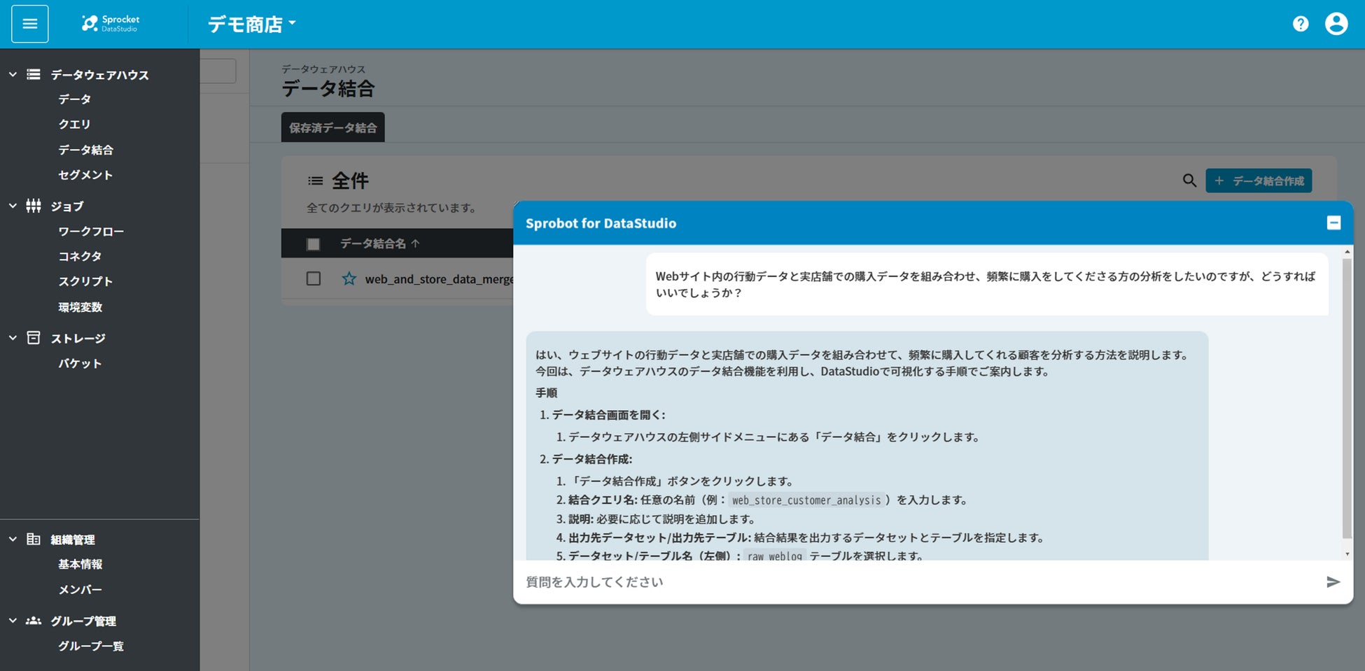 「Sprobot for DataStudio」は、Sprocket DataStudio内でCDPによる顧客データ活用に関するやりとりができる生成AIのチャットボットです。自然言語での対話を通じて、以下のようなサポートを提供します。