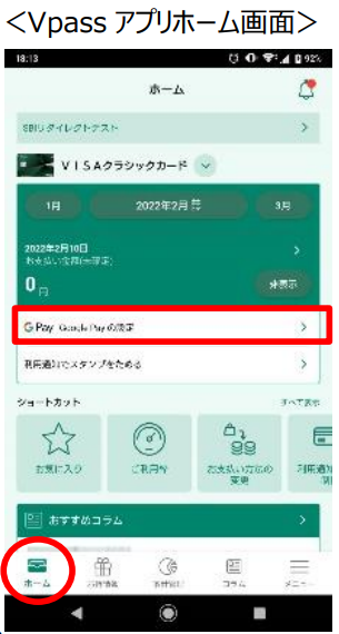 2.「Vpass」アプリを起動し、ホーム「 Google Pay の設定」ボタンから「Visaのタッチ決済の設定」を行ってください。