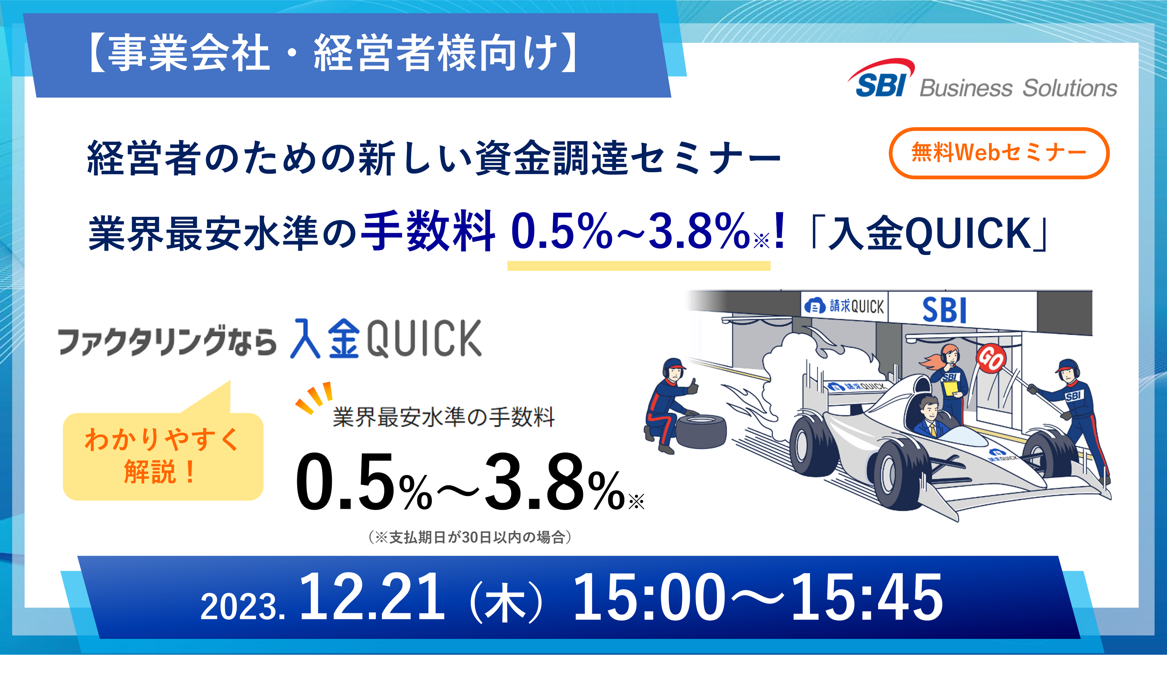 総合フィンテックソリューション企業であるSBI FinTech Solutions株式会社の子会社で、バックオフィス支援サービスを提供するSBIビジネス・ソリューションズ株式会社(本社:東京都港区、代表取締役社長:夏川 雅貴、以下「当社」)は、事業会社・経営者様向けに「業界最安水準の手数料0.5%~3.8%*1 !新しいファクタリング 入金QUICKセミナー」を12月21日(木)15時から開催しますので、お知らせいたします。