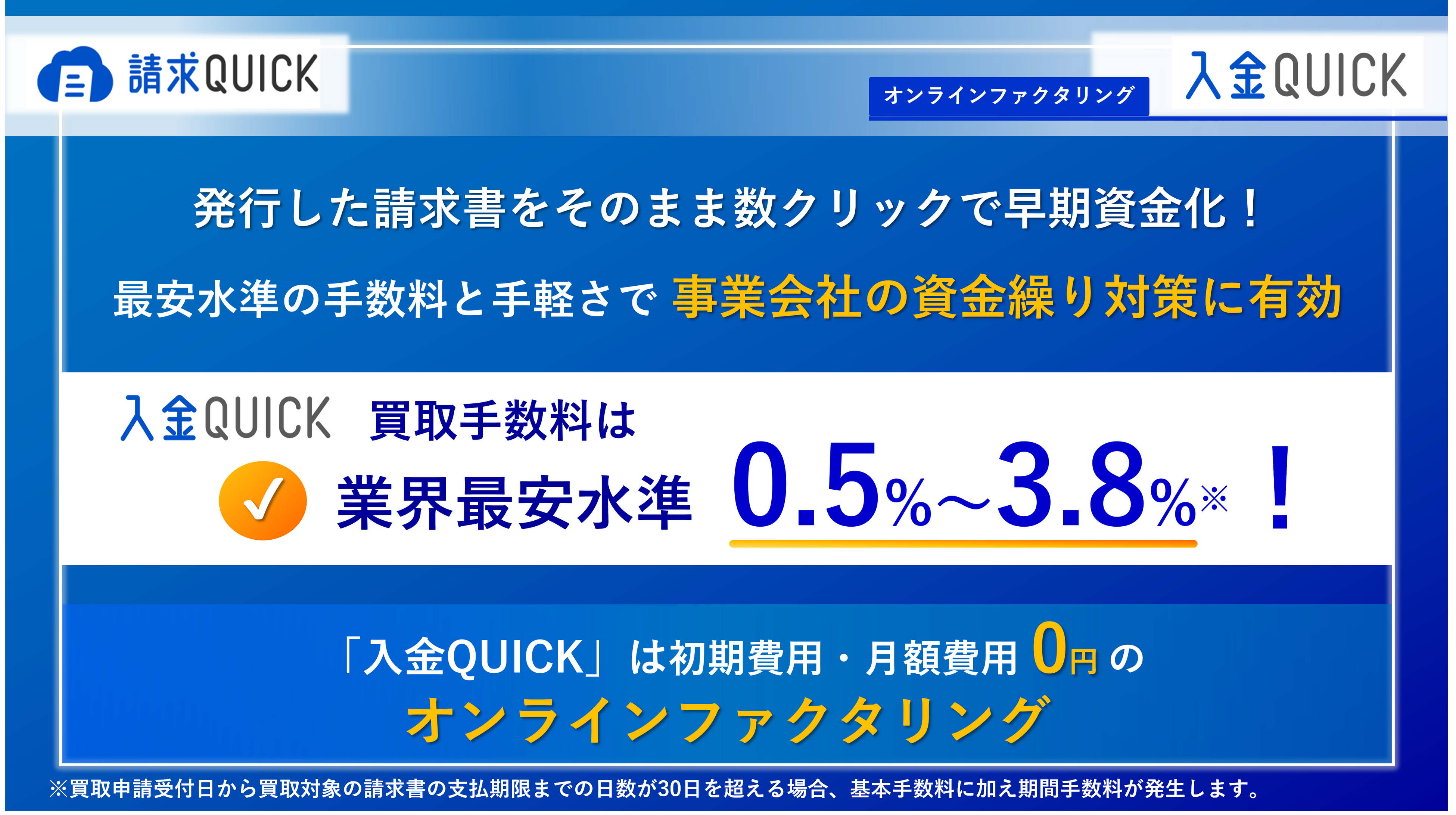 「入金QUICK」は、中小企業の突発的な資金ニーズにスピーディーに対応可能なオンラインファクタリングサービスです。「請求QUICK」で発行した請求書をそのまま数クリックで資金化でき、基本手数料は買取対象とする請求書金額の0.5%~3.8%*1と業界最安水準かつ初期費用や月額固定費用のないシンプルな料金体系で、請求書買取申請から最短2営業日*2でお振込みが可能です。「入金QUICK」は、中小企業の皆さまが抱える資金繰りに関する課題を「安さ・早さ・手軽さ」すべての点において解消し、事業の成長をご支援いたします。