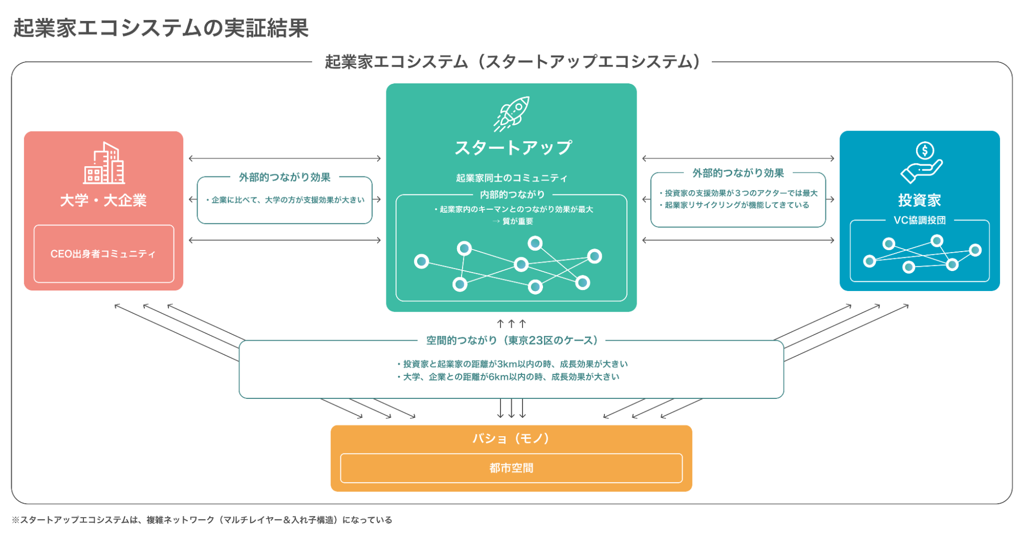 起業家は、リソースに乏しく、出身大学・出身企業などからリソース(人材、技術・知識、顧客、ビジネスノウハウなど)を動員することによって成長できる。そして、起業家の出身母体(リソース源:大学、企業)との距離は、近い方がリソースを動員し易いと考えられている。実証分析の結果、東京においてはこの距離が6Km以内だとスタートアップが成長し易いということが明らかになった。