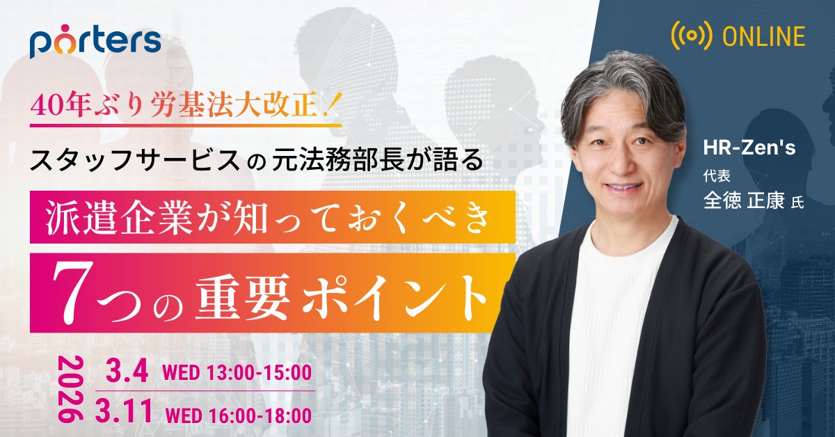 人材ビジネス向けマッチングシステムを提供するポーターズ株式会社(東京証券取引所グロース.証券コード5126、東京都港区、代表 西森 康二)は、「40年ぶり労基法大改正!スタッフサービスの元法務部長が語る、派遣企業が知っておくべき7つの重要ポイント」と題した無料セミナーを2026年3月4日(水)13:00~と3月11日(水)16:00~オンラインで開催いたします。