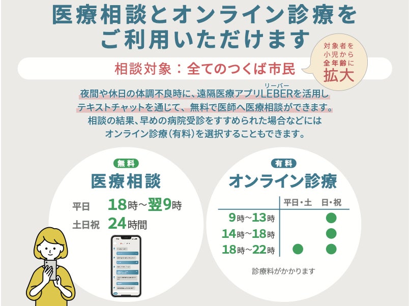 株式会社リーバー(茨城県つくば市、代表取締役:伊藤俊一郎)では、2024年12月25日(水)より当社の遠隔医療アプリLEBER(リーバー)を活用して、「つくば市休日夜間小児デジタル急患センター」を実施しておりましたが、このたび2025年12月1日(月)より、対象者を小児から全年齢に拡大することとなりました。