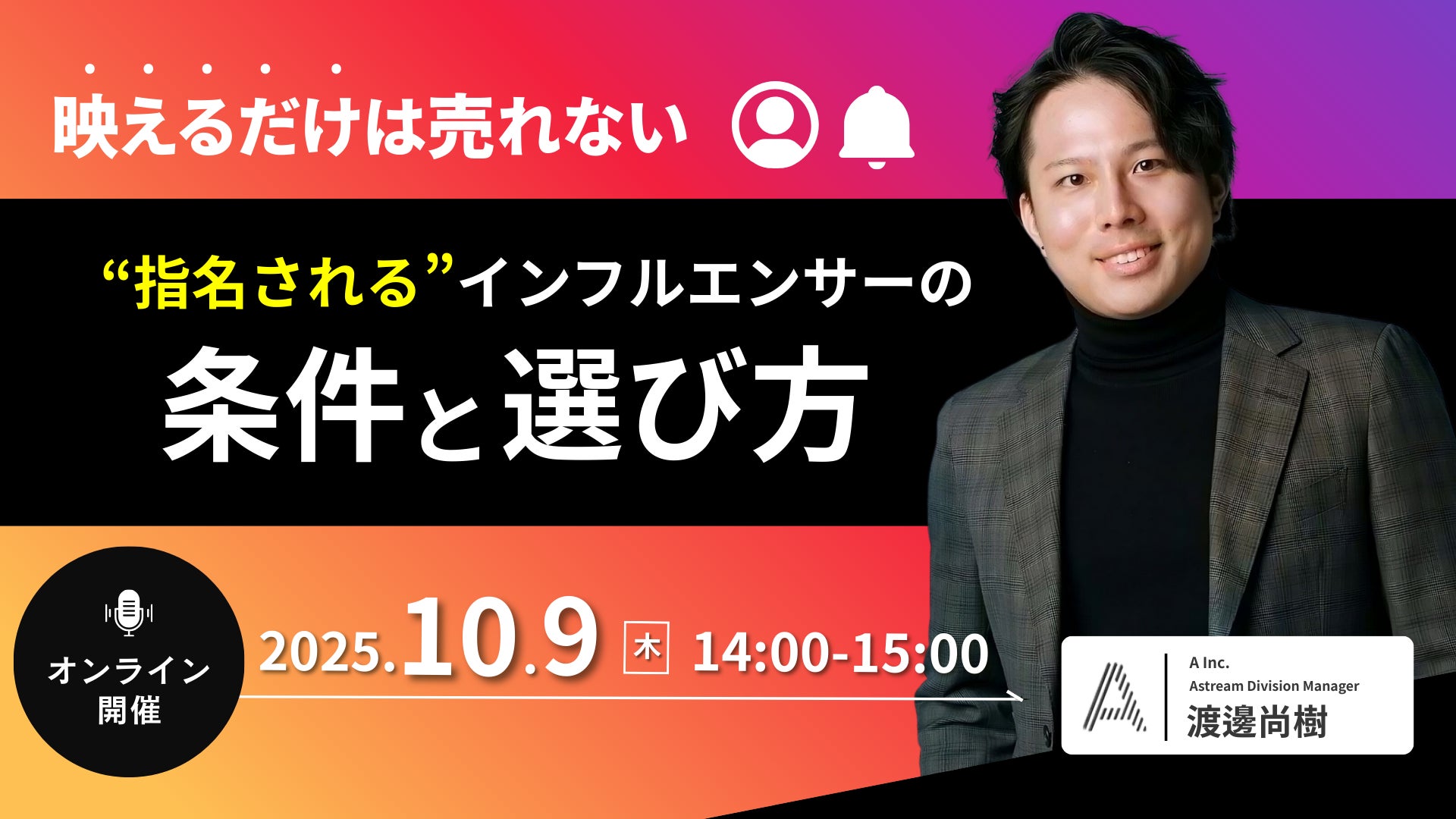 本ウェビナーでは、「売上につながるインフルエンサーの条件」を徹底解説。さらに、キャスティング精度を高め、施策の再現性を向上させる当社ツール「Astream」の活用事例もご紹介いたします。