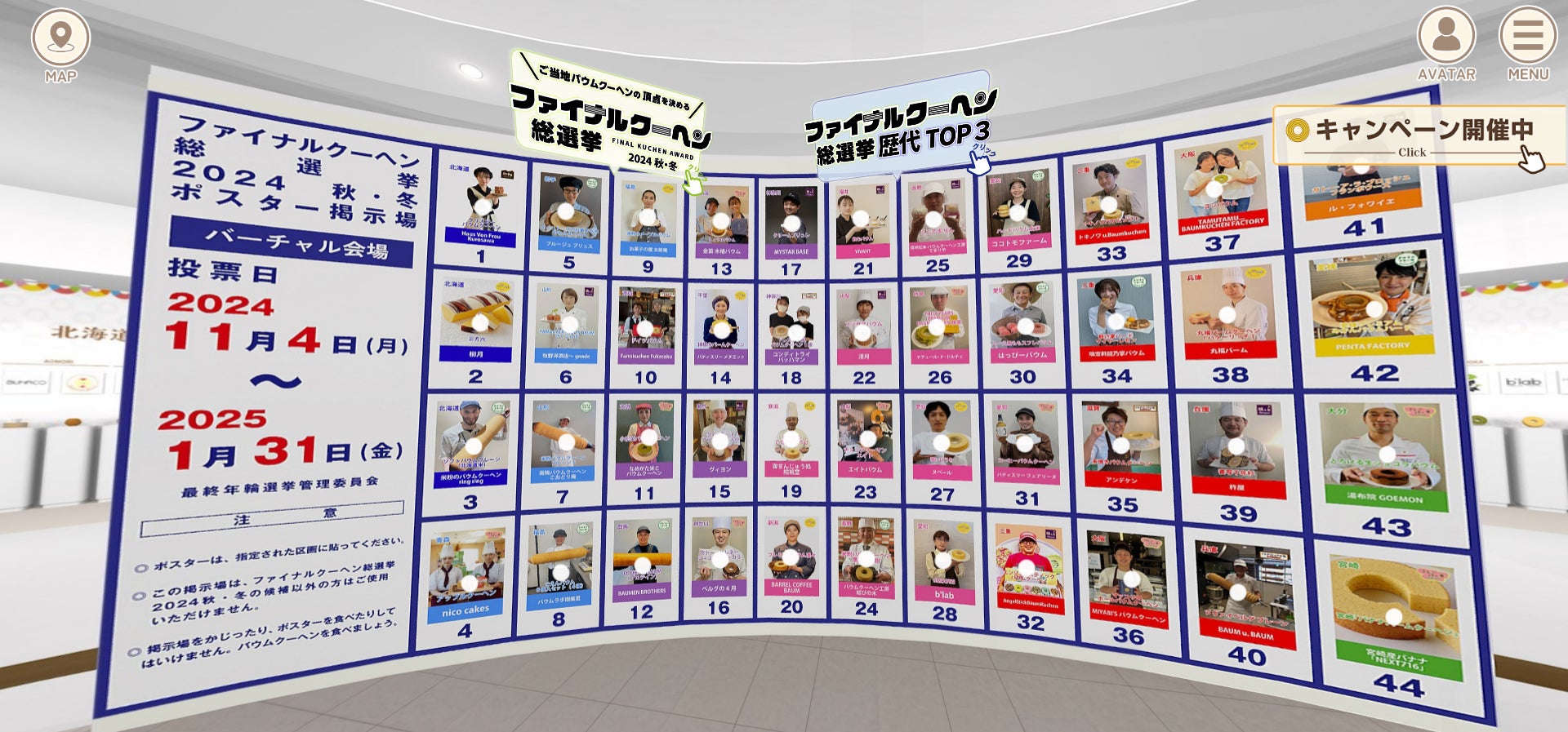 実際の会場にそっくりなバーチャル会場でも投票への参加が可能です。ご自宅でじっくり考えながらご投票ください。地元のお店を応援するもよし、公式Webサイトに掲載されている各店の商品PR動画を見て心打たれた商品に投票するもよし、1位のバウムクーヘンを予測し投票もよし。みなさまのご投票お待ちしております!