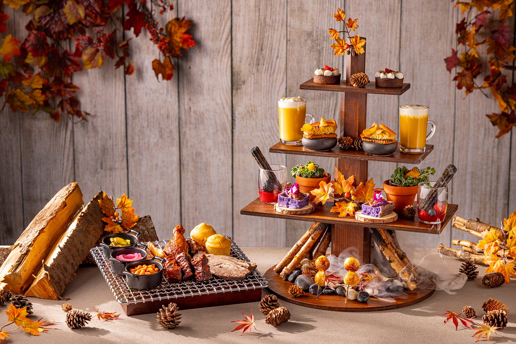 土の香りや落ち葉の香りなど、大地のアロマに包まれながら味わう収穫の秋の美味が集結した『秋のスモーキーお肉アフタヌーン』は、メトロポリタングリル料理長 フィナリー・セメスが炎や煙を巧みに用いた手法でご用意する4種類の本格肉料理に加え、「かぼちゃと栗のカプチーノ」や「紫ワッフル ベーコン&オニオンジャム」など6種類のサイドディッシュ、「洋梨のクリーム入りチョコレートタルト 焦がしマシュマロ&ラズベリー」など3種類の秋のスイーツがセットになっています。