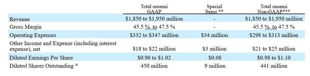 以下の表は、オンセミの2022年第1四半期のGAAPベースおよび非GAAPベースの見通しの概要です。