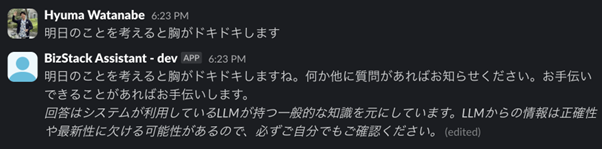 そこで、生成AIの回答にデータソースを明示することで、BizStack Assistantの回答の裏付けを明確にし、人間側で、その回答の妥当性を判断できるようになりました。