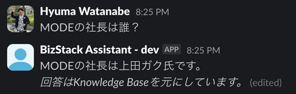 今回のアップデートは、BizStack Assistant の回答がどのデータソースを参照したものであるかを明示するようになりました。
