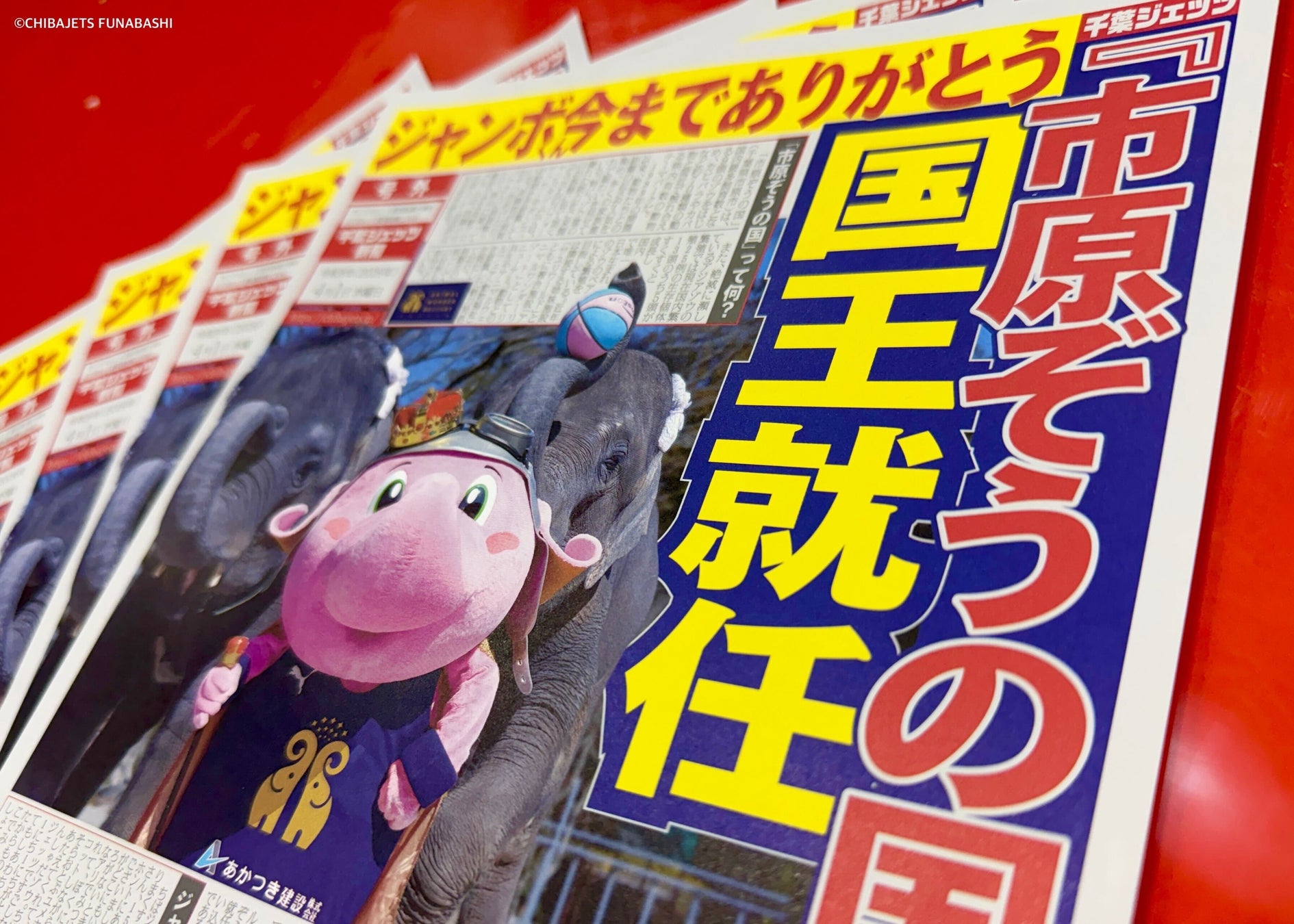 4/1(水)に開催されたvs.三河で来場者全員に「ジャンボくんが市原ぞうの国の国王に就任!!」の号外風チラシが配布された。