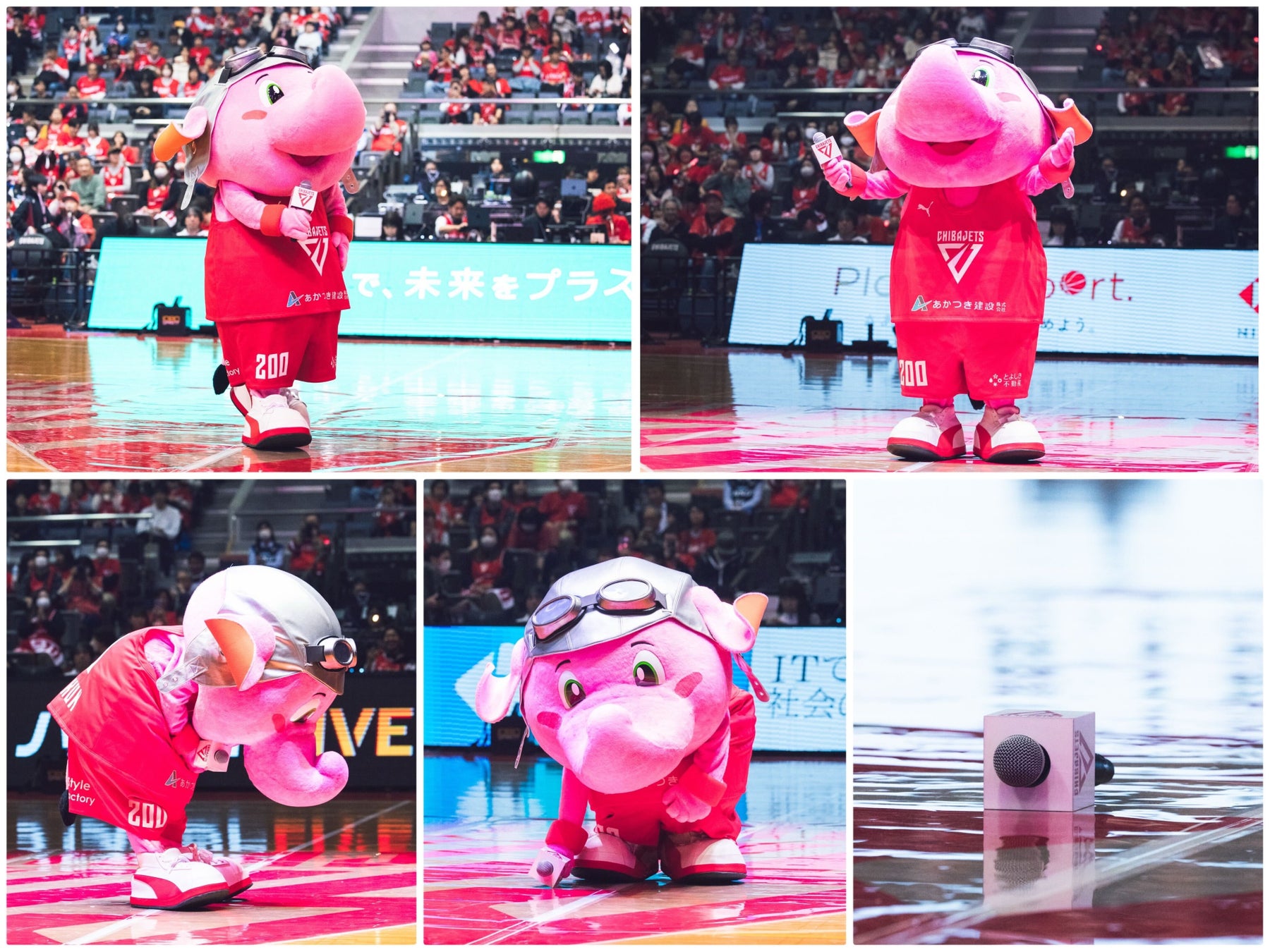 4/1(水)vs.三河の試合前にジャンボくんによる「千葉ジェッツ公式マスコット卒業風セレモニー」を開催。最後にマイクを置いて退場するパフォーマンスのオマージュを見せ、伝説のアイドル「山口百恵」さんを彷彿とさせるご挨拶を爆笑と少しの悲しみが入り混じる温かい雰囲気の中で披露した。