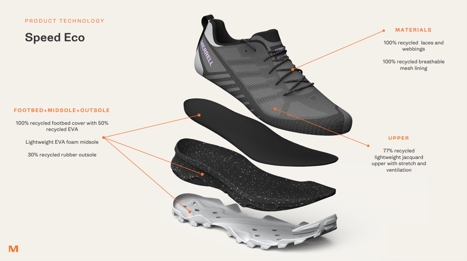 当シューズは現存するMERRELLのトレイルシューズの中で最もサステナブル化を実現したエコフレンドリーなモデルであり、立体的な造形美が美しいジャガードアッパーには77%リサイクル素材を採用。更にシューレース、ウェビング、メッシュライニング、フットベッドカバーには100%リサイクル素材を使用し、シューズ全体に動物性由来の素材を使用していないため、ビーガンフレンドリーなシューズです。MERRELL独自の透湿防水メンブレンを搭載したアッパーを採用することで、急な天候の変化にも対応し、靴内部をドライに保ちつつ、外部からの水の侵入を防ぐパフォーマンス性も兼ね備えています。