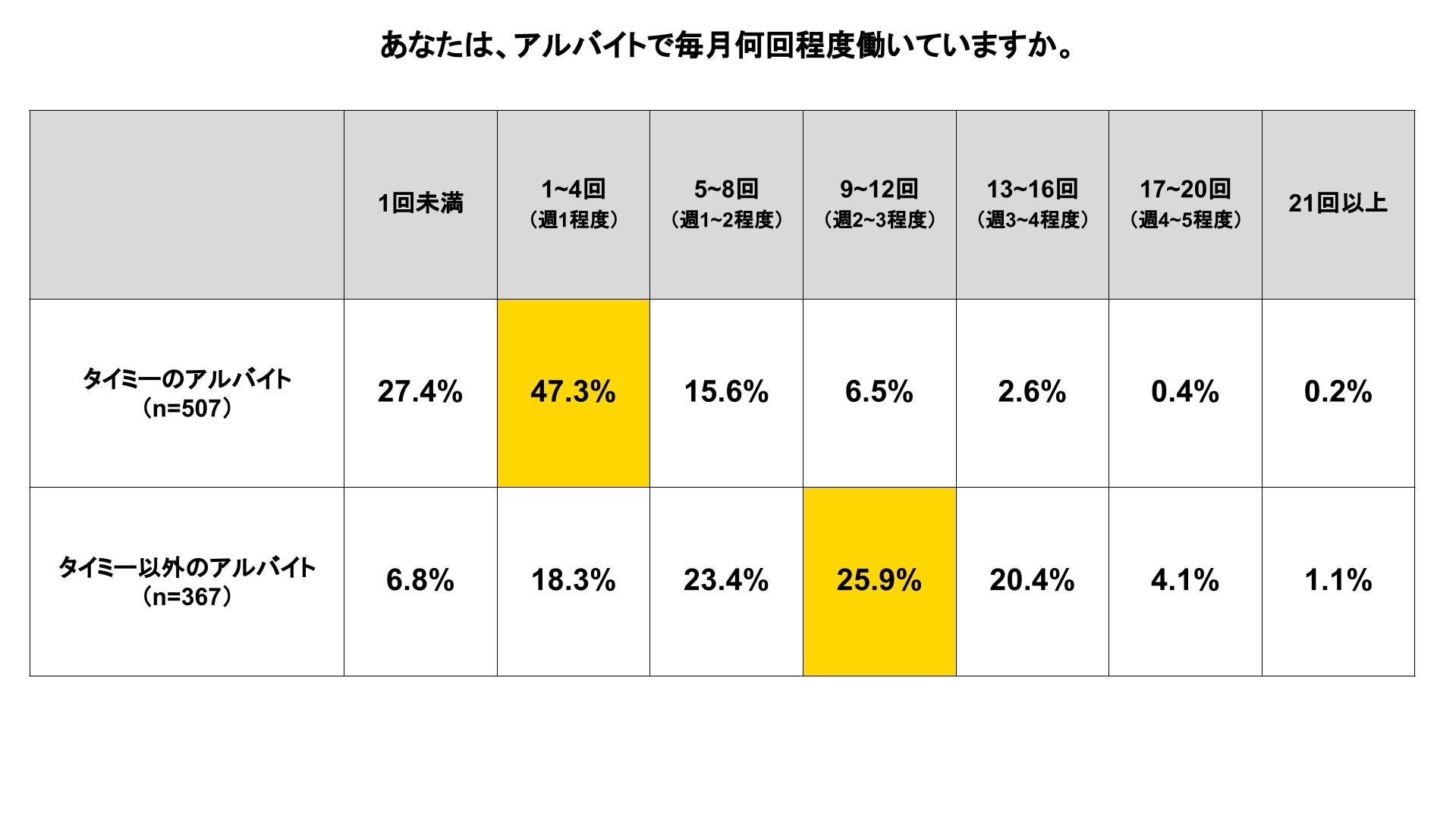 また、毎月の勤務回数を比較すると、“タイミーのアルバイト”では「月1〜4回(週1程度)」が47.3%で最多である一方、“タイミー以外のアルバイト”では「月9〜12回(週2〜3程度)」が25.9%で最多。