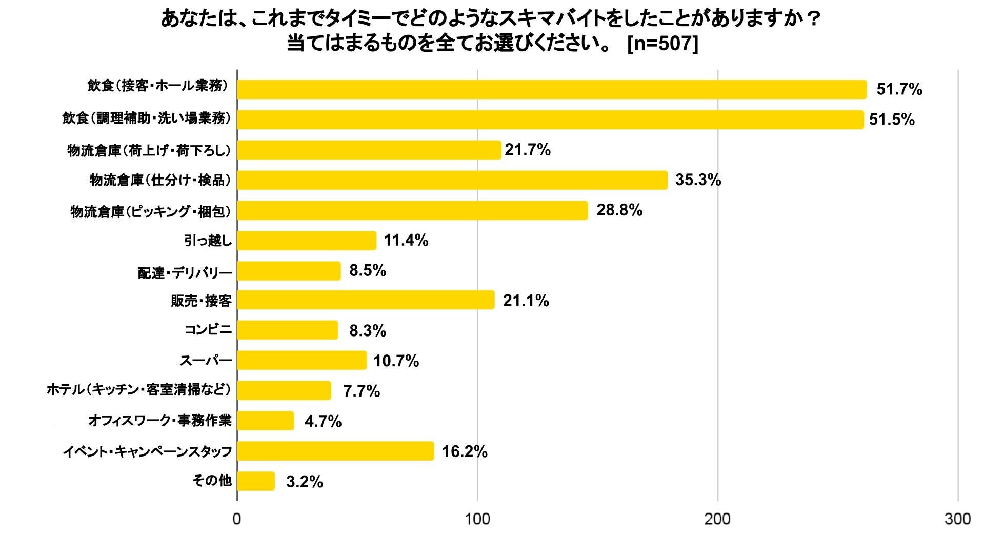 学生がこれまでタイミーで働いたことがあるスキマバイトの職種で最も多いのは、「飲食(接客・ホール業務)(51.7%)」で、次いで「飲食(調理補助・洗い場業務)(51.5%)」が多い。