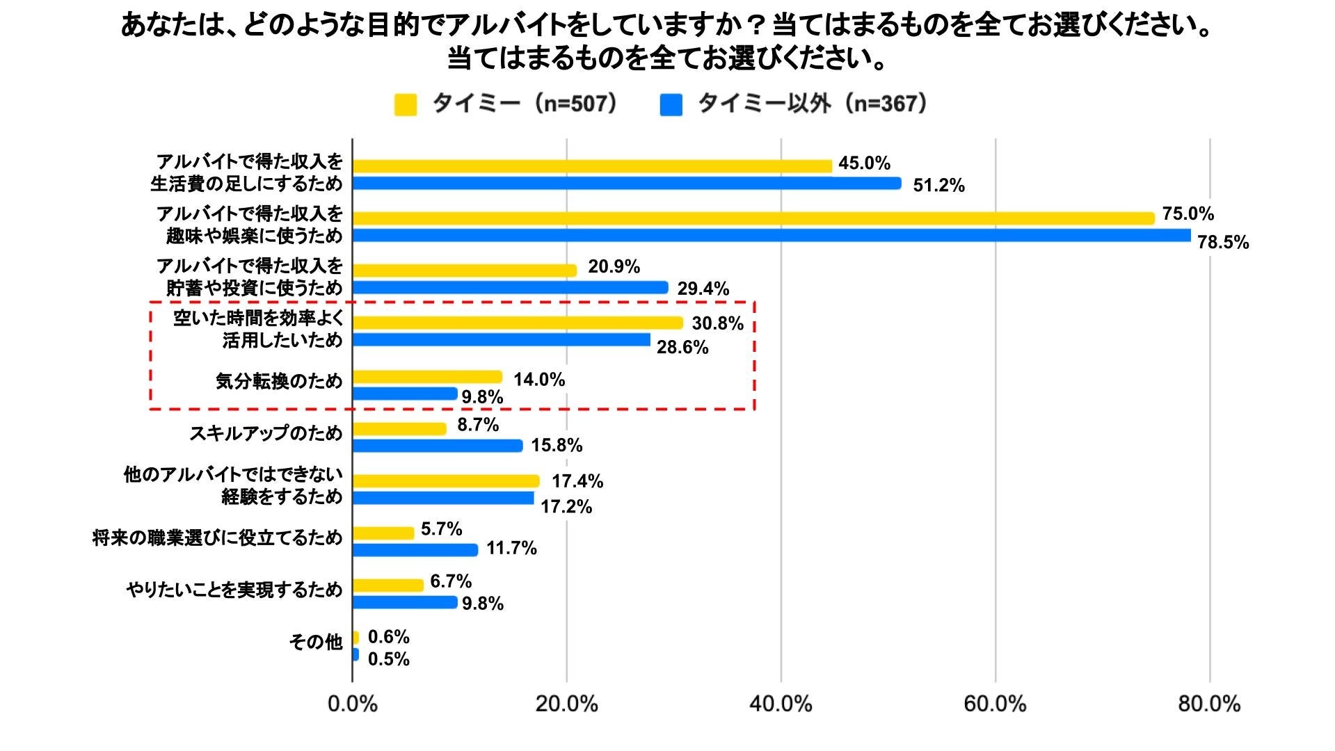 また、“タイミーのアルバイト”では「気分転換のため」が14.0%で、“タイミー以外のアルバイト”と比較すると4.2ポイント高い結果となった。