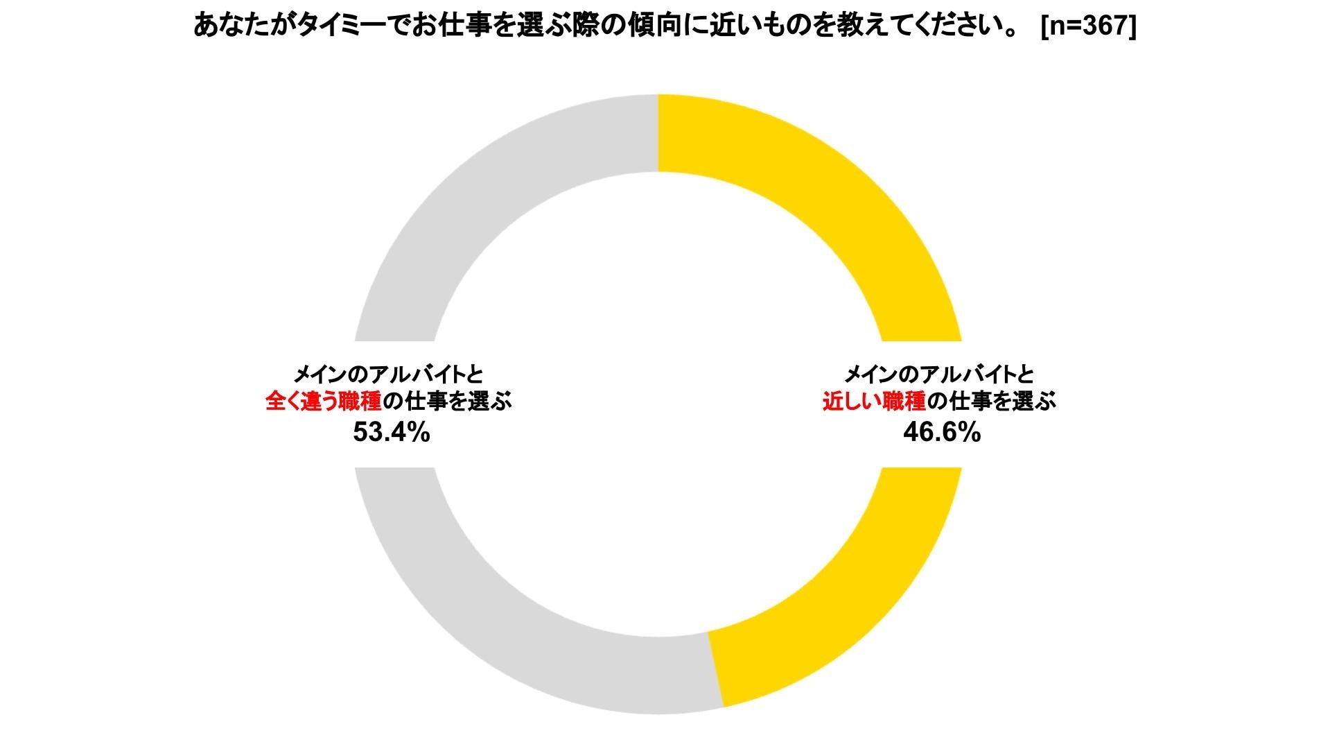 なお、“タイミーのアルバイト”と“タイミー以外のアルバイト”を掛け持ちする学生にタイミーで仕事を選ぶ際の傾向を聞いたところ、「メインのアルバイトと近しい職種の仕事を選ぶ」は46.6%、「メインのアルバイトと全く違う職種を選ぶ」は53.4%となり、二分する結果となった。メインのアルバイトと近しい職種を選んで自身のスキルアップを目指したり、全く違う職種を体験して気分転換や新しいスキルを身につける機会を得るなど、さまざまな目的でスキマバイトが活用されていることがわかる。