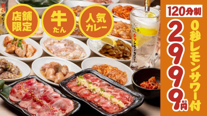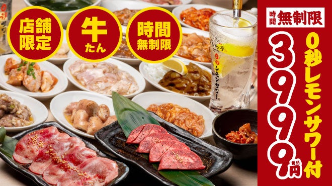 「仙台塩ホルモン」の他、「旨とろ豚たん」「薄切り牛たん」などタンメニュー4種に〆にぴったりの「まかない牛たんカレー」含むフード24品と、「0秒レモンサワー」ソフトドリンク各種が飲み食べ放題!