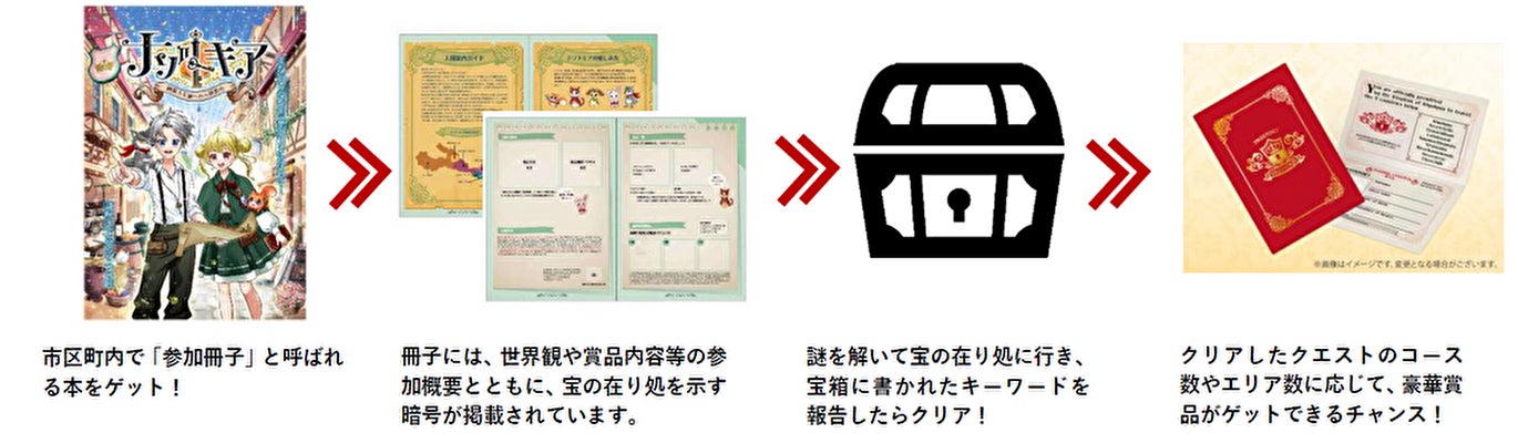 「ナゾトキア~謎解き王国への入国案内~」は、東京都清瀬市・豊島区・東村山市、埼玉県所沢市・狭山市・入間市・飯能市・横瀬町・秩父市の9つの市区町を舞台とする大規模周遊型宝探しイベントです。参加者は、「クエスト」と呼ばれる謎解きを中心としたミッションに参加し、「ワクワク」と呼ばれるポイントを貯めていきます。多くの「ワクワク」を貯めることで、豪華賞品やノベルティ等を獲得することができます。今回、エリア内に設置されたクエストの総数は400以上と、過去にタカラッシュが実施した、リアル宝探しイベントの中でも最も多いクエスト数となっています。