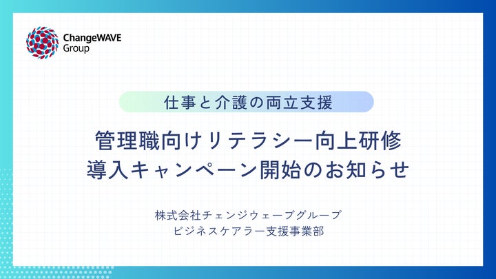 仕事と介護の両立支援を行う株式会社チェンジウェーブグループ(本社:東京都港区、代表取締役社長:佐々木裕子)は、2025年4月から順次施行される改正育児・介護休業法への企業の対応を見据え、管理職向けリテラシー向上研修の導入キャンペーンを期間限定で12月5日より開始します。今月22日で改正施行まであと100日となるため、企業の早急な対策検討の後押しとなるように実施するもので、通常価格の20%引きで提供します。