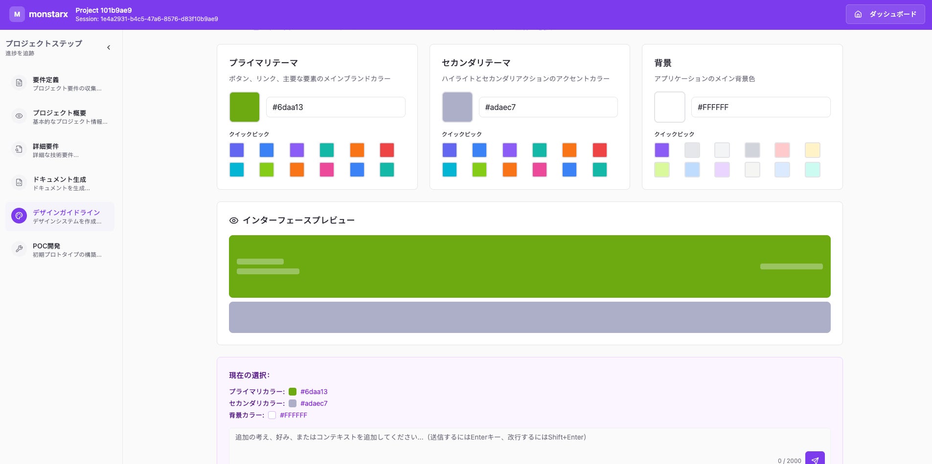 MonstarXは、こうした課題を解消するために生まれました。複雑なプロンプトを入力する必要なく、対話形式で思考を整理しながらアイデアを具体化できる仕組みを提供します。誰もが自分のアイデアをすぐにプロトタイプとして形にし、チームと共有できることで、よりスムーズな意思決定とスピード感のあるプロジェクト推進を実現します。
