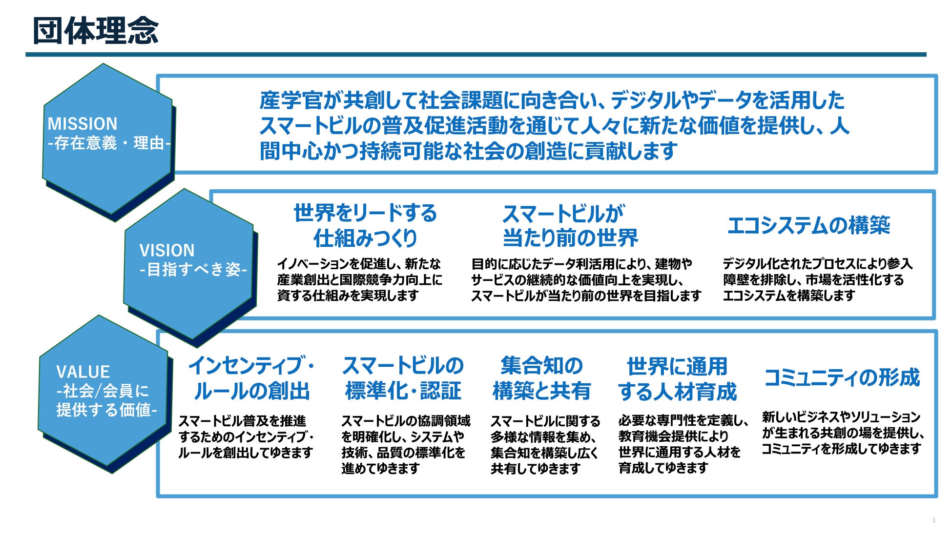 スマートビル共創機構は、添付の設立趣意書並びに団体理念に基づき、業種や分野の垣根を越えて、データの利活用の促進による新たな産業の創出や国際競争力の向上を図ると共に、スマートビルに関わる人材育成や協調領域の整備による技術標準化等を行っていくことを目的としています。