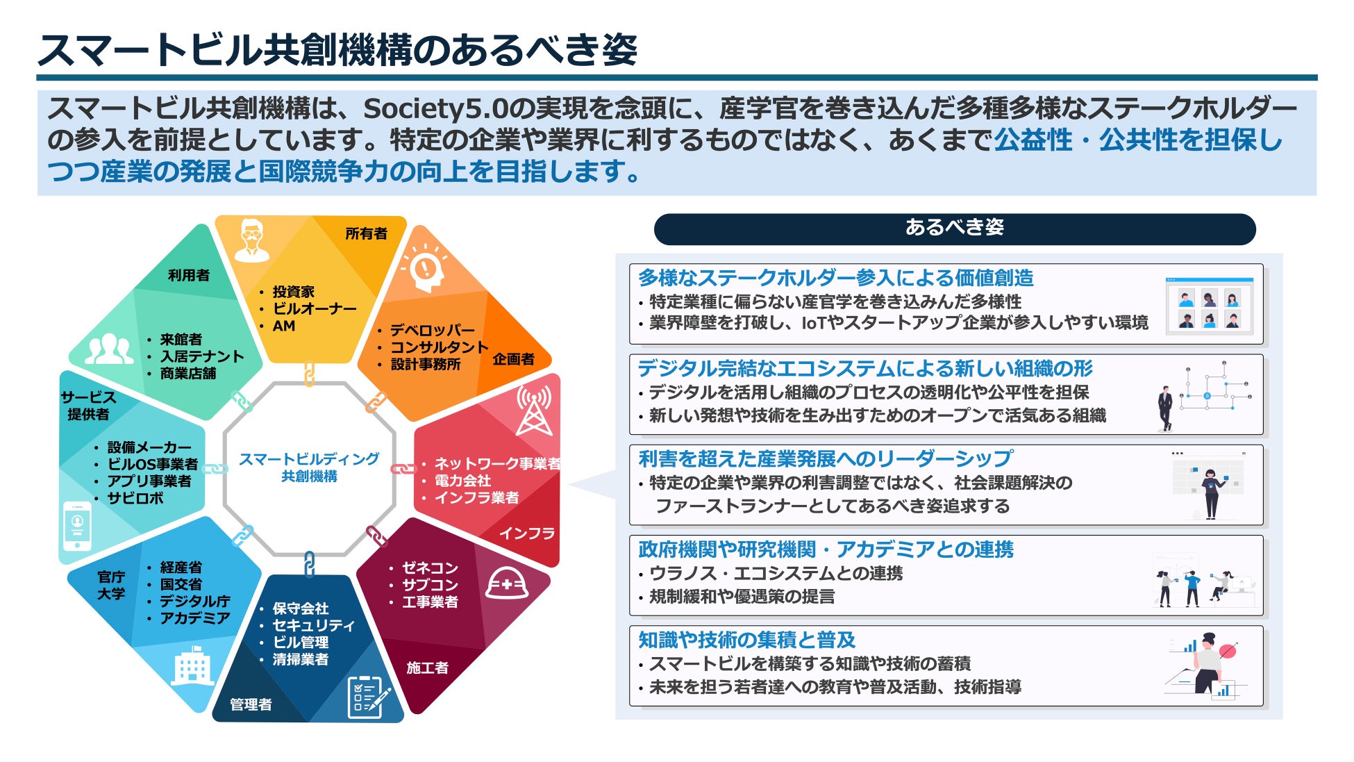 スマートビル共創機構は、様々なステークホルダーにバリューが提供できる機能・役割を担ってゆきます。