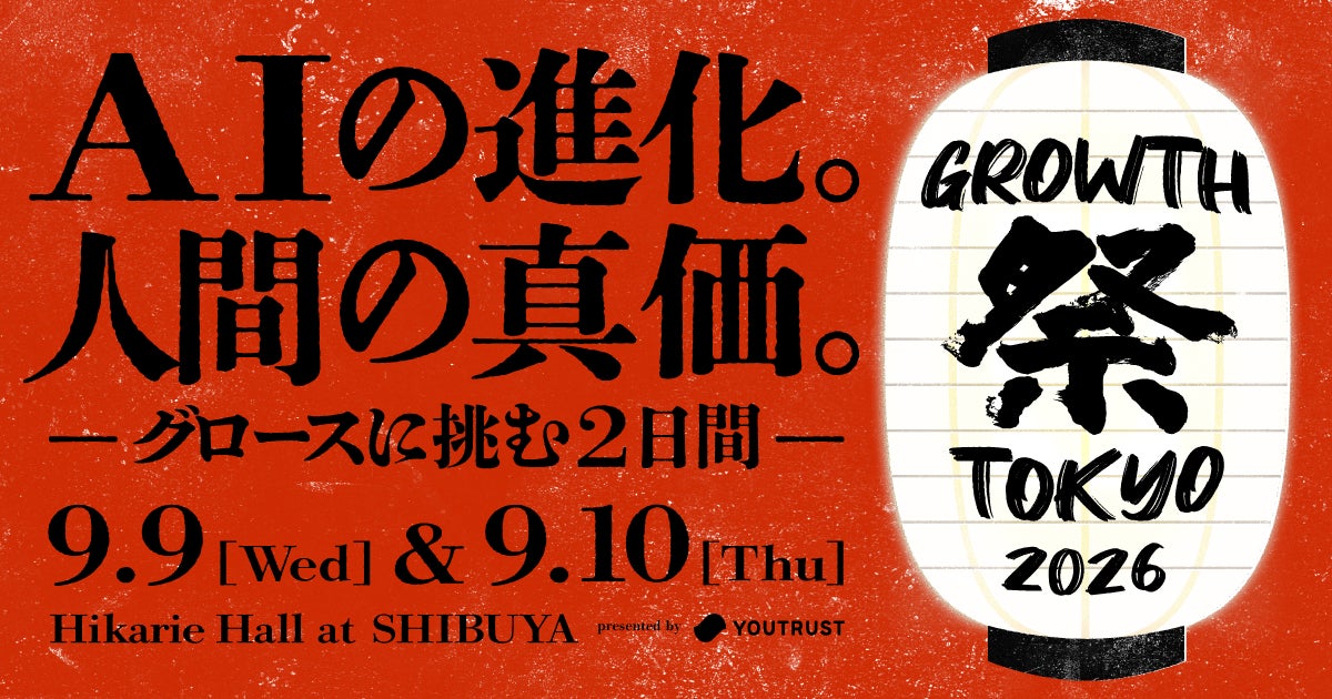 プロフェッショナルネットワーク「YOUTRUST」を開発・運営する株式会社YOUTRUST(本社:東京都渋谷区、代表取締役 社長:岩崎由夏)は、「GROWTH 祭 TOKYO 2026」を2026年9月9日(水)・10日(木)に開催することをお知らせいたします。