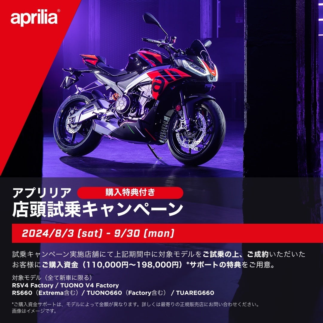 ピアッジオグループジャパン株式会社 (本社:東京都港区芝 2 丁目、代表取締役 ネリ・ミクラウス)は、スポ ーティーでスタイリッシュなデザインと、ビギナーからベテランライダーまでもが虜になる本物志向の走りと楽しさ が魅力のアプリリアのスポーツバイクを、お近くの正規販売店でご体感いただける特典付き試乗キャンペーン を、2024 年 8 月 3 日(土)から 9 月 30 日(月)まで、キャンペーン対象店舗にて実施いたします。 当キャンペーンでは、アプリリアをご試乗いただいた方で、実施期間中にご試乗した店舗にて試乗したモデル の新車をご成約された方全員に、購入サポート金として 110,000 円~198,000 円※をプレゼントする特典をご用 意し、新たなスポーツバイクライフのスタートを応援いたします。 (※サポート金額はモデルにより異なります)