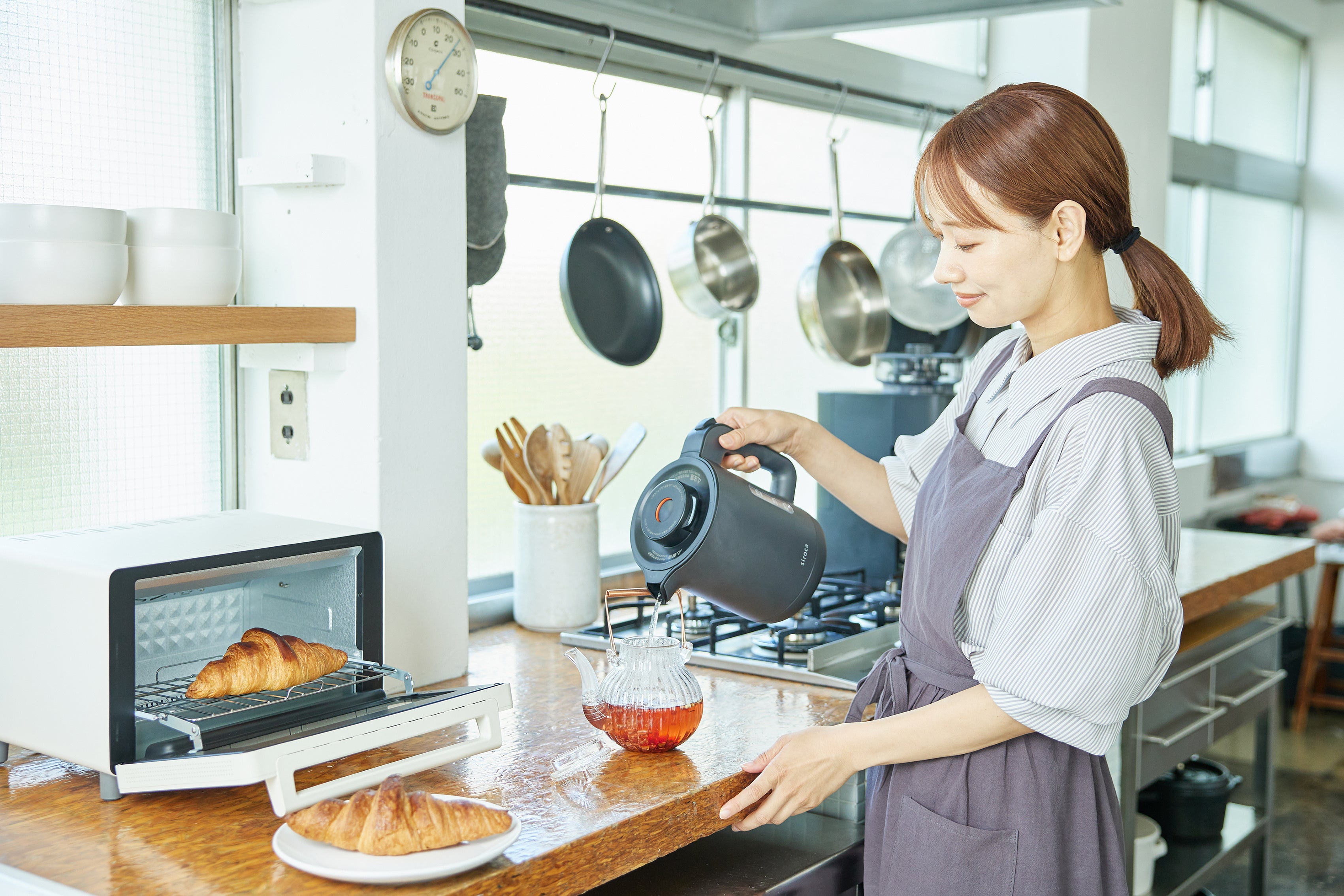 欲しいときに欲しい分だけ、すぐにお湯が沸かせる電気ケトルは、便利なキッチン家電のひとつ。便利な反面、湯沸かし時にふき出す蒸気や、誤って倒してしまった場合の湯こぼれなど、安全面が気になるという方も多いのではないでしょうか。特に、転倒時の湯こぼれについては、本製品が取得している電気製品の安全を示す「Sマーク」*1の取得基準が改正され、より安全性が重要視されています。