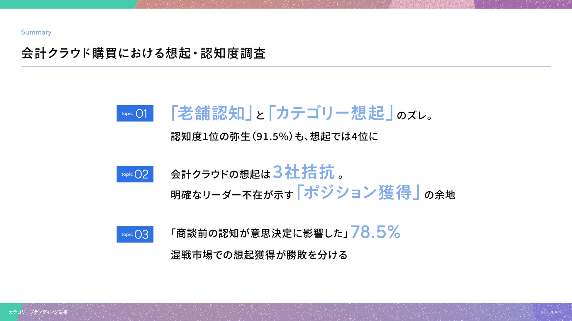 02|会計クラウドの想起は3社拮抗。明確なリーダー不在が示す「ポジション獲得」の余地