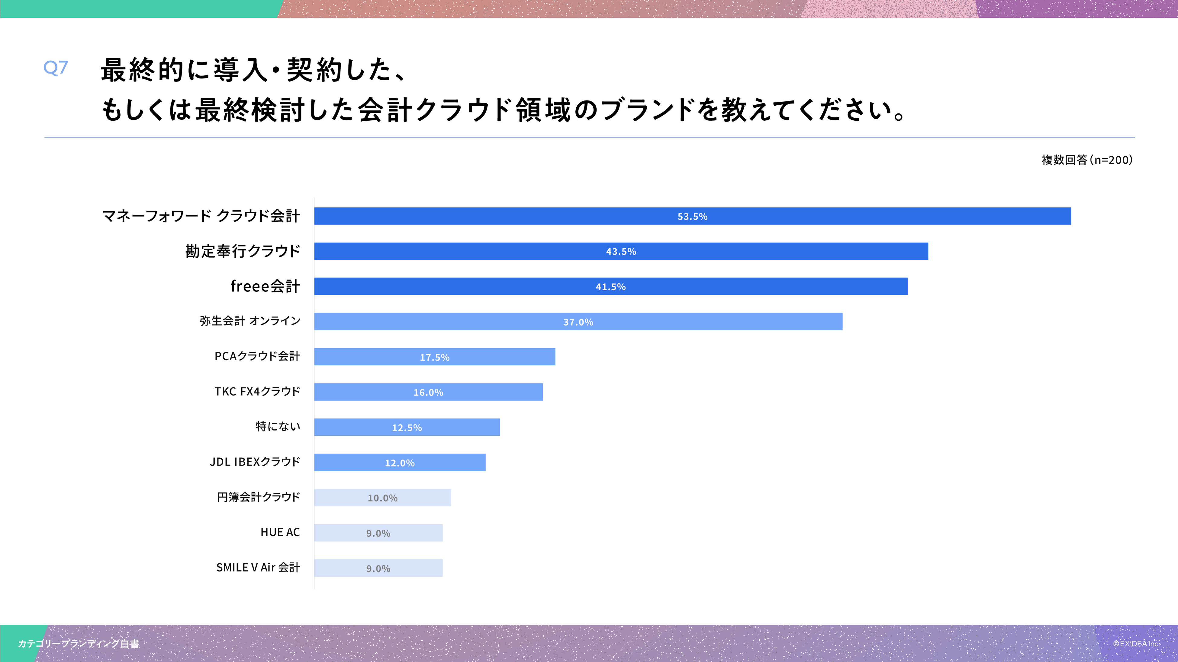 「Q7. 最終的に導入・契約した、もしくは最終検討した会計クラウド領域のブランドを教えてください。(複数回答)」(n=200)と質問したところ、「マネーフォワード クラウド会計」が53.5%、「勘定奉行クラウド」が43.5%、「freee会計」が41.5%という回答となりました。