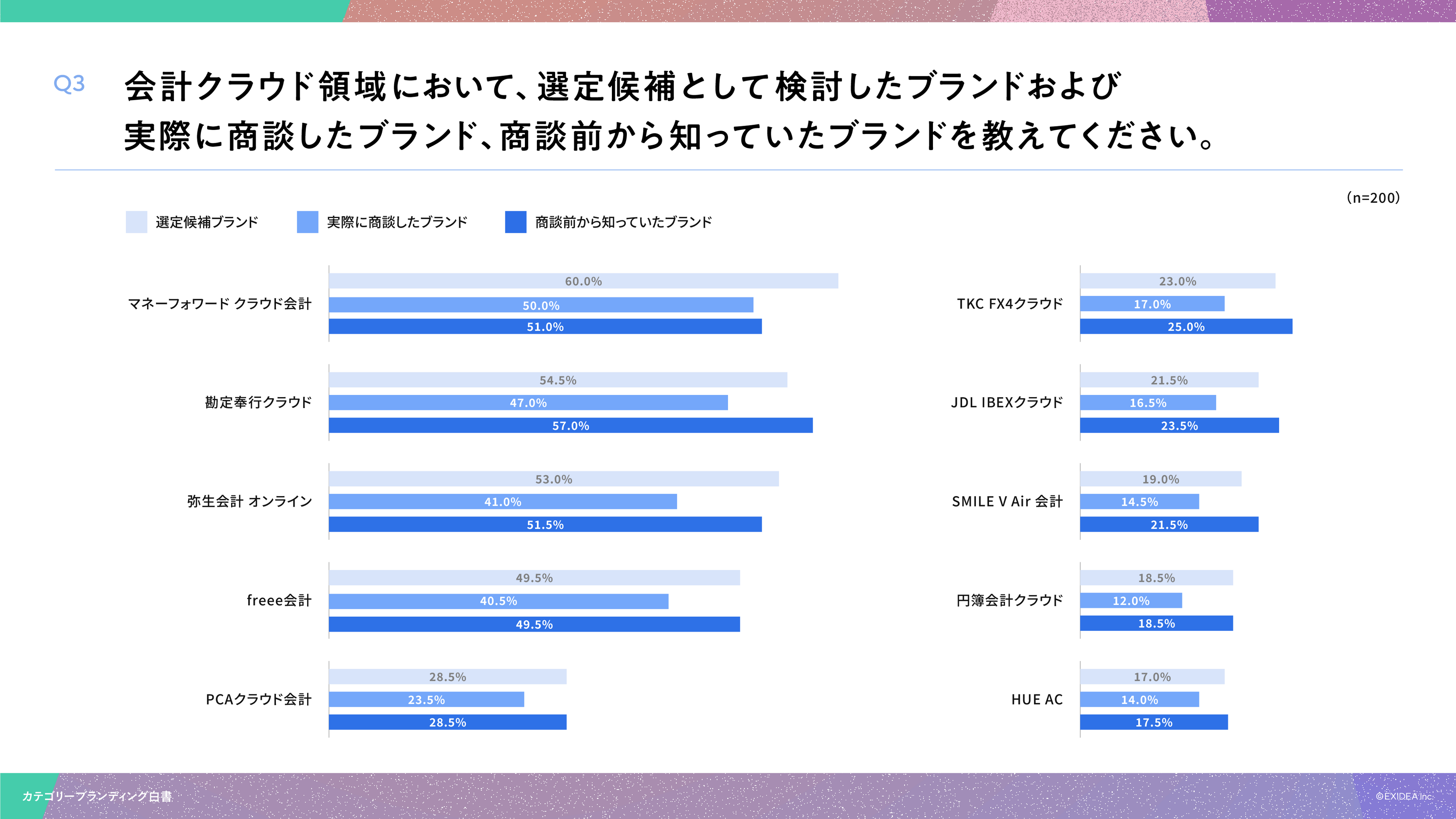 「Q3. 会計クラウド領域において、選定候補として検討したブランドおよび実際に商談したブランド、商談前から知っていたブランドを教えてください。」(n=200)と質問したところ、選定候補ブランドは「マネーフォワード クラウド会計」が60.0%、実際に商談したブランドは「マネーフォワード クラウド会計」が50.0%、商談前から知っていたブランドは「勘定奉行クラウド」が57.0%という回答となりました。