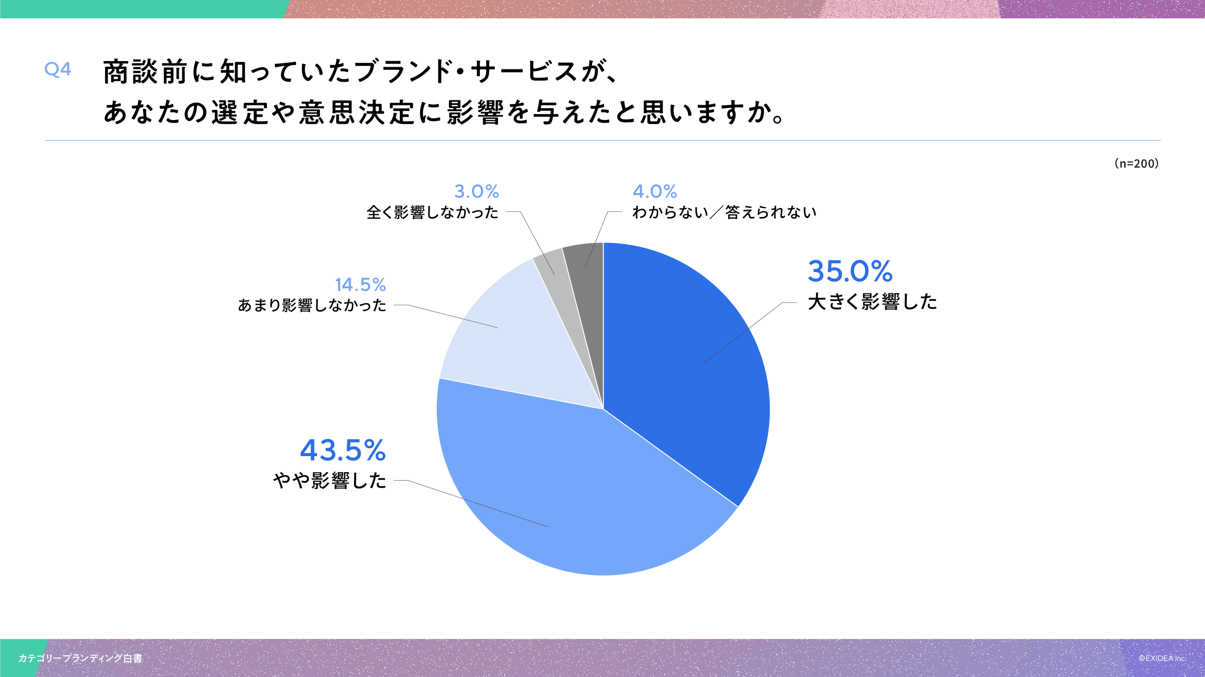 「Q4. 商談前に知っていたブランド・サービスが、あなたの選定や意思決定に影響を与えたと思いますか。」(n=200)と質問したところ、「大きく影響した」が35.0%、「やや影響した」が43.5%という回答となりました。