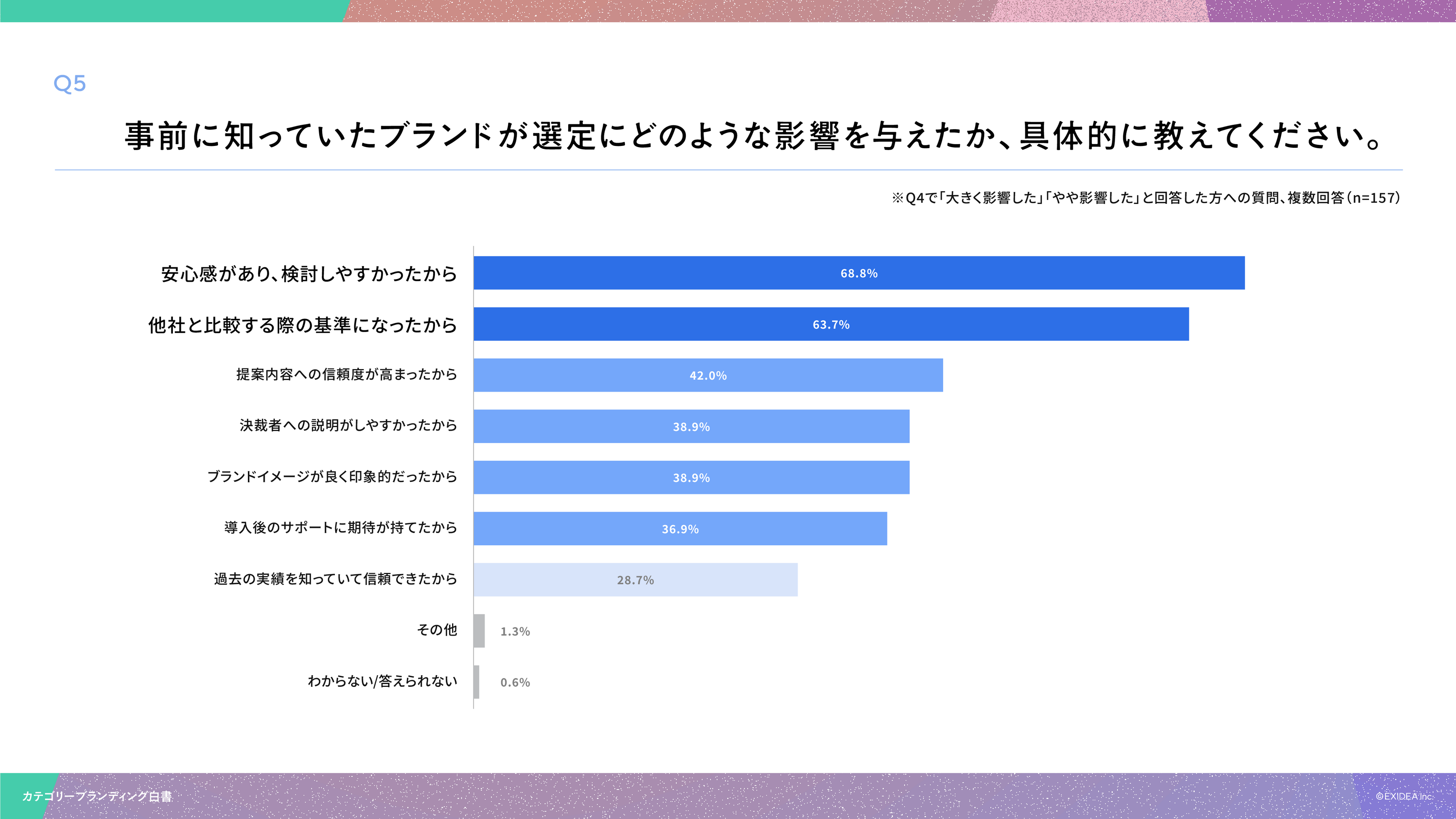 「Q5. Q4で「大きく影響した」「やや影響した」と回答した方にお聞きします。事前に知っていたブランドが選定にどのような影響を与えたか、具体的に教えてください。(複数回答)」(n=157)と質問したところ、「安心感があり、検討しやすかったから」が68.8%、「他社と比較する際の基準になったから」が63.7%、「提案内容への信頼度が高まったから」が42.0%という回答となりました。