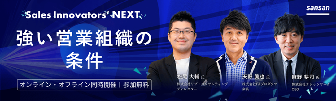 Sansan株式会社が主催する「Sales Innovators' NEXT」は営業力強化・営業生産性向上をテーマにしたイベントで、自社の営業に革新を起こすためのヒントを提供しています。