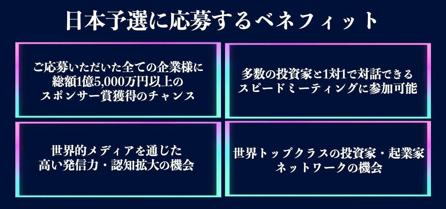 全国のスタートアップの皆様、自社の優れた技術やサービスを日本、そして世界へ発信する機会として、ぜひご応募ください。