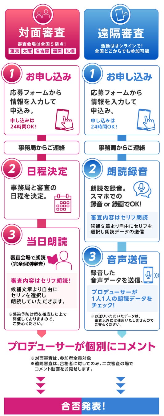 プロジェクト参加審査は対面と遠隔(リモート)のお好きな方を選べます。遠隔審査であれば審査会場が遠い方や日程が合わない方でも無理なく応募が可能です。指定の日時に会場へお越しいただき朗読を行っていただく対面審査、ご都合のいい時に録音した朗読データを送っていただく遠隔審査、お好きな方法でご応募ください。