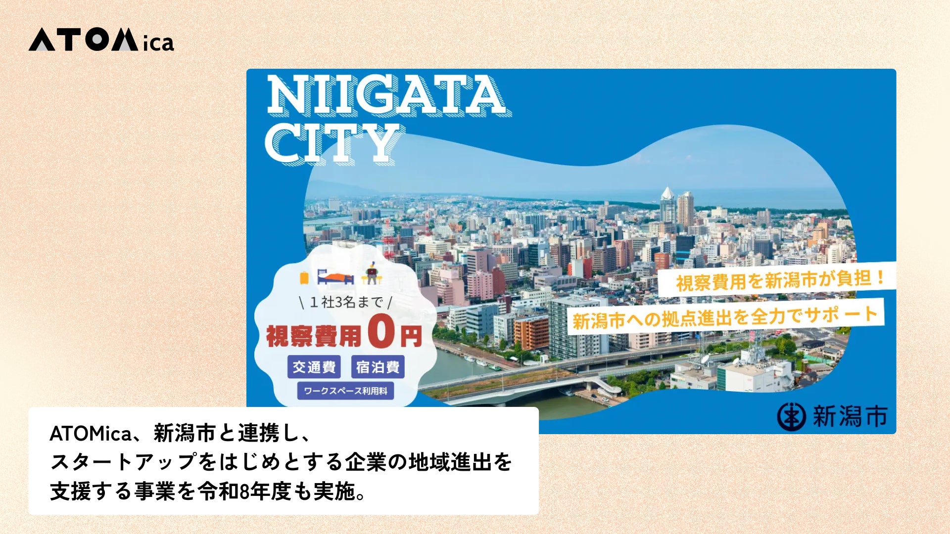 株式会社ATOMica(本社:宮崎県宮崎市、代表取締役Co-CEO:嶋田 瑞生、南原 一輝、以下「ATOMica」)は、新潟市と連携し、「新潟市企業誘致促進事業@新潟サテライトオフィス」を令和8年度も実施いたします。