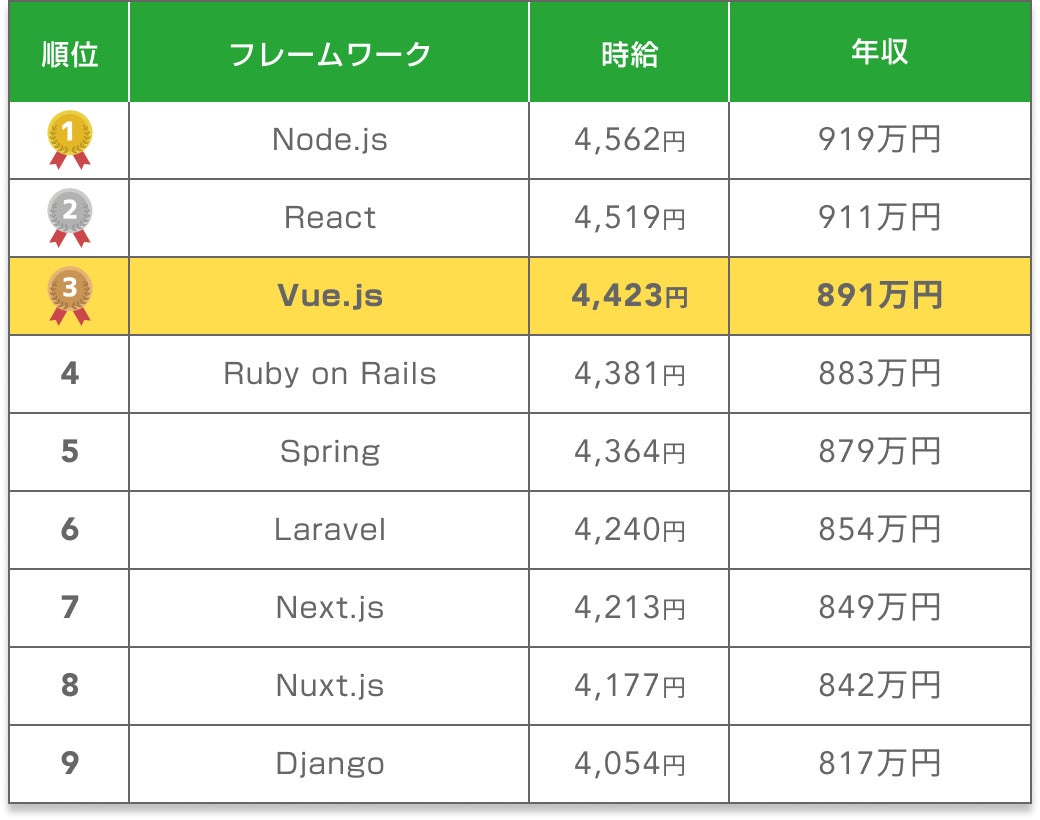 Vue.js案件では、平均年収が891万円となっており、フレームワーク年収ランキングでは3位という結果になっています。Node.js(919万円、1位)、React(911万円、2位)に続く上位ポジションで、JavaScriptエコシステムの三強が年収ランキングの上位を独占しています。