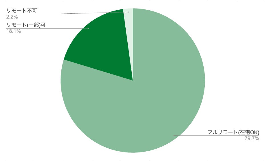 Vue.js案件のリモート対応状況を見ると、フルリモート可能な案件が79.7%、一部リモート可能が18.1%、リモート不可はわずか2.2%という結果になっています。97.8%の案件でリモートワークが可能という優れた環境です。