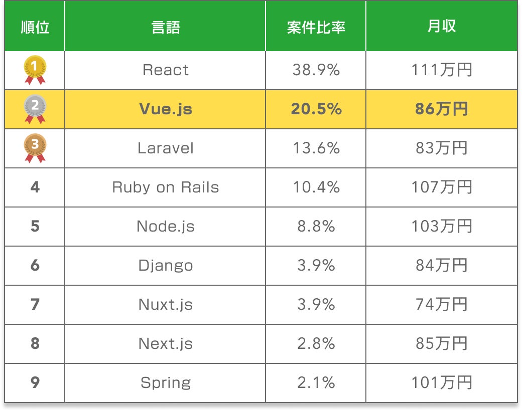 案件数2位でありながら年収ランキング3位(891万円)という構造は、Vue.js技術者にとって豊富な案件選択肢と高い報酬水準を両立できる魅力的な技術領域であることを示しているといえるでしょう。