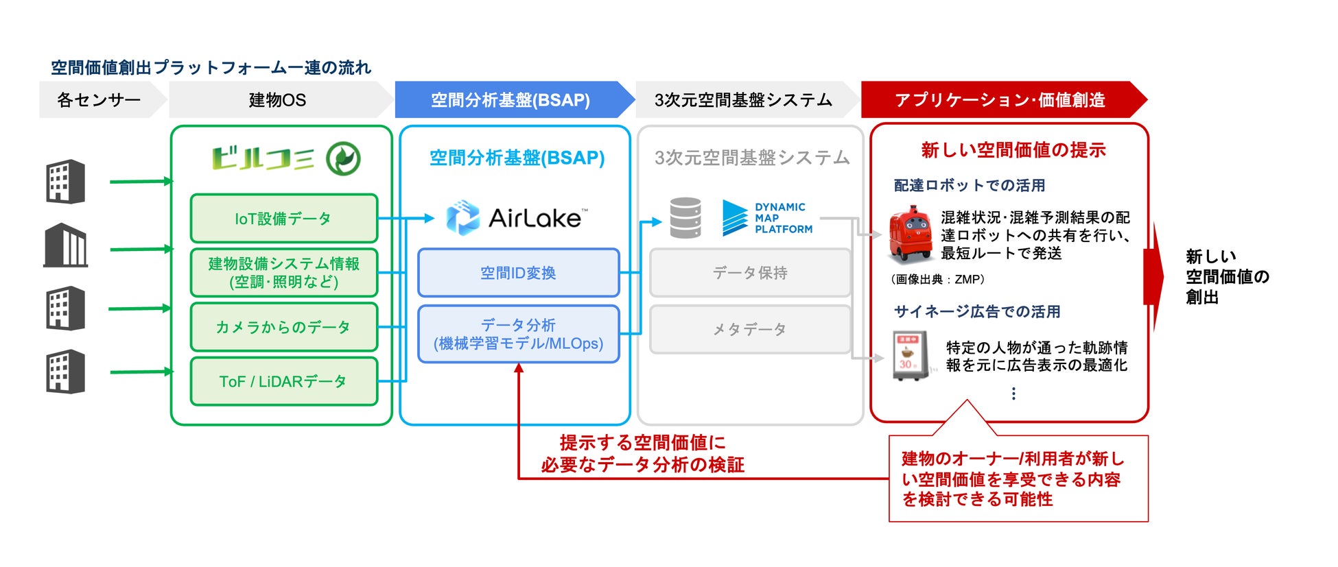 竹中工務店が提供するビルOS「ビルコミ」から屋内外に設置されているToFやLiDARなどのIoTセンサーを取得し、空間IDに紐づけ、屋内外の建物の様子を建物空間ID分析基盤BSAPに登録しました。
