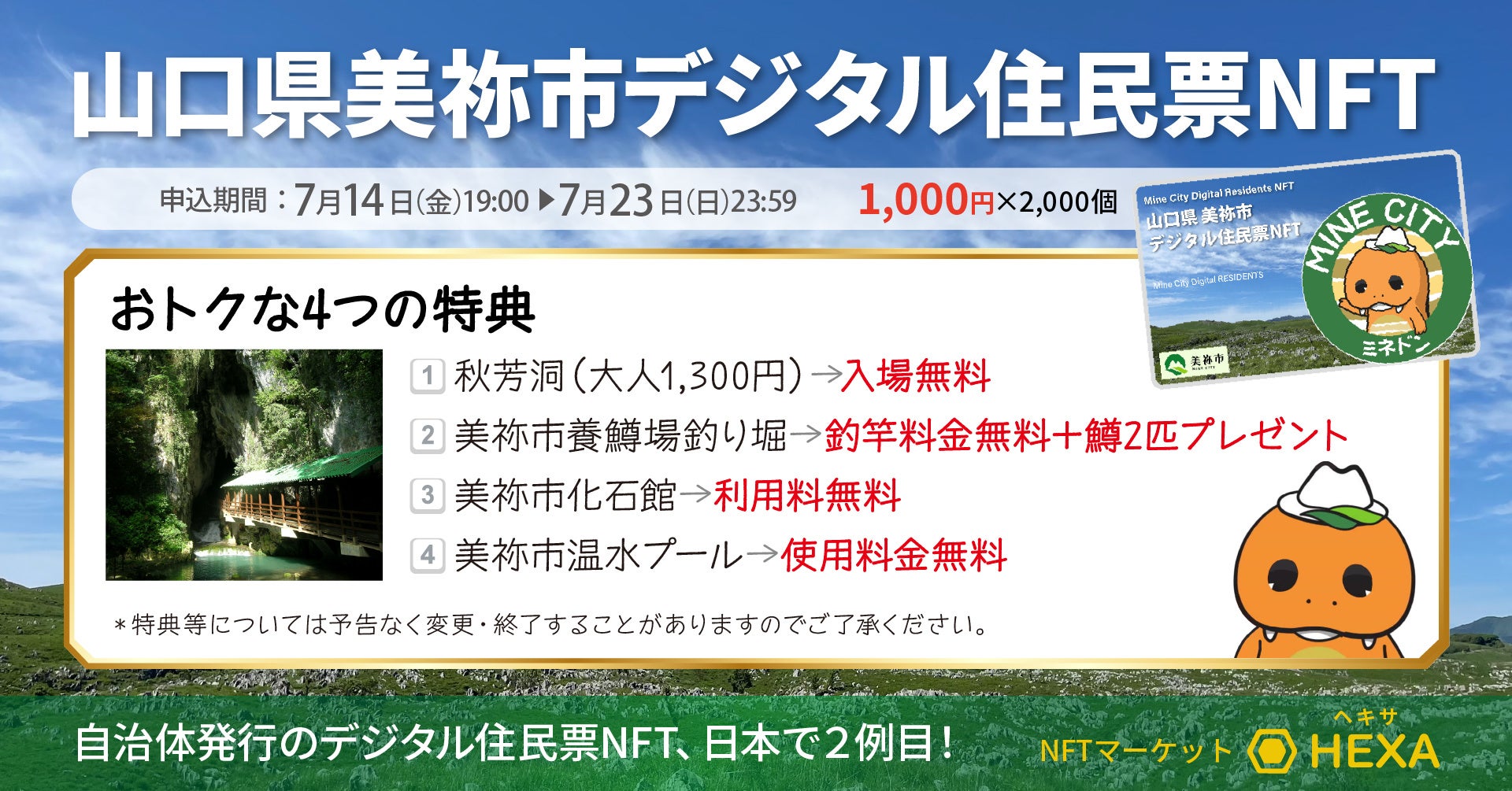 日本最大級のNFTマーケット「HEXA(ヘキサ)」を運営するメディアエクイティ株式会社(代表取締役:椛島 誠一郎)は、東武トップツアーズ株式会社(社長執行役員:百木田 康二)と連携し、山口県美祢市(市長:篠田 洋司)のデジタル住民票NFTを7月14日(金)から販売します。