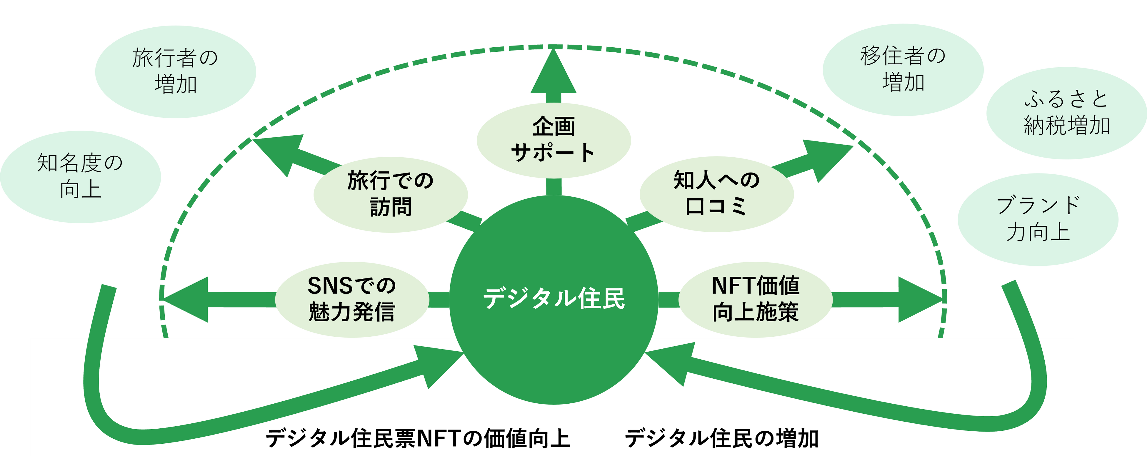 山口県美祢市のデジタル住民票NFTの販売によって、デジタル住民がNFTを通じてステークホルダーになることで、NFT価値向上のための自立分散的な活動が起こり、継続した関係住民の増加に繋がることを目指します。