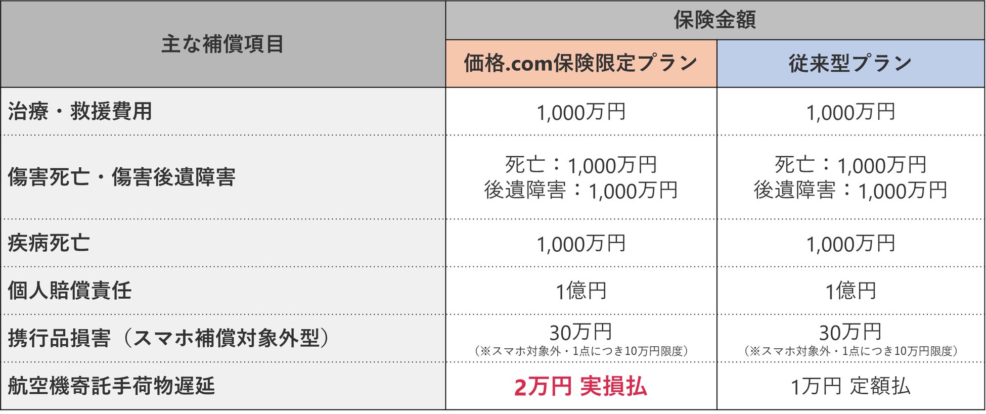 「価格.com保険」では、ニーズの高い「航空機寄託手荷物遅延」の補償を強化した、当社限定プランの取り扱いを開始します。本プランは、従来プランの「治療・救援費用(1,000万円)」や「携行品損害(30万円)」(※3)といった手厚い補償はそのままに、航空会社に預けた手荷物の到着遅延に伴う生活必需品の購入費をカバーする本補償を拡充。補償限度額を従来の「定額1万円」から「実損2万円」へと引き上げることで、より安心で充実した補償内容を実現しました。