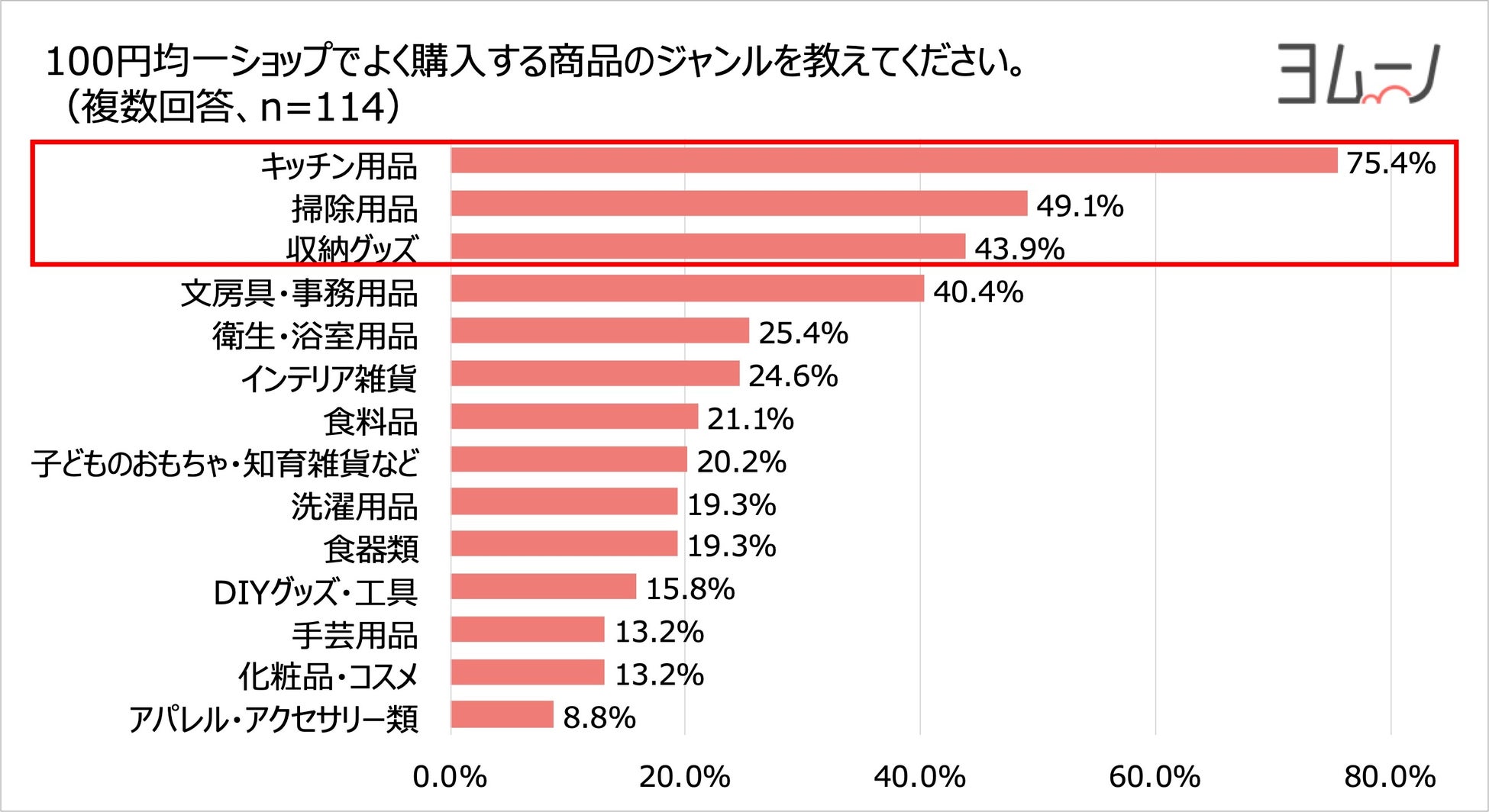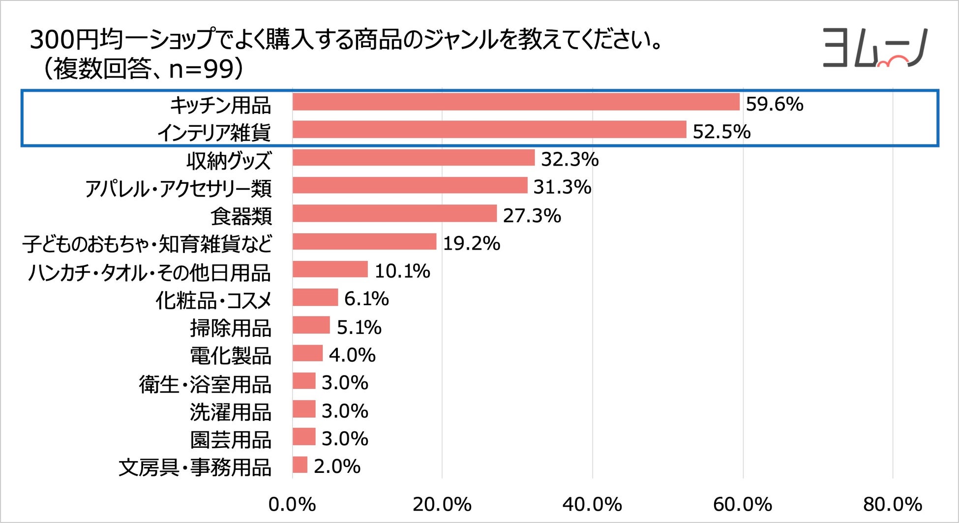 一方、300均はキッチン用品に次いで「インテリア雑貨」が52.5%に上りました。3月〜4月は春の新生活準備シーズンでもあることから、用途に応じた100均・300均の利用機会がさらに増加しそうです。